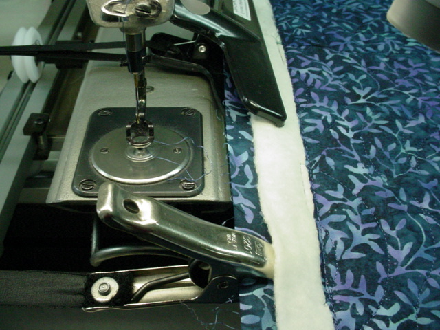 I worked on a quilt today that I received that had only 1 1/2 to 2″ of backing fabric for me to clamp to. I have stitched into my nice featherweight plastic clamps twice today!! I actually sewed them to the backing fabric because they were too close to the quilt top & covered by the batting.