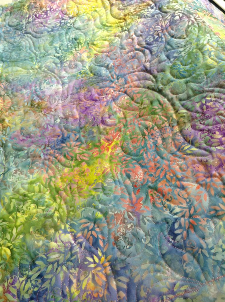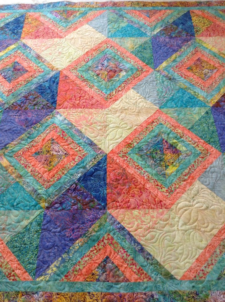 I finished up this quilt of Martha’s last night. Its called Coral Breeze. She quilt is from a class she took while on a quilting cruise. The quilting pattern is Paradise by Ann Bright, thread is Coral color & batting is Hobbs 80/20. The backing is also a very colorful batik.