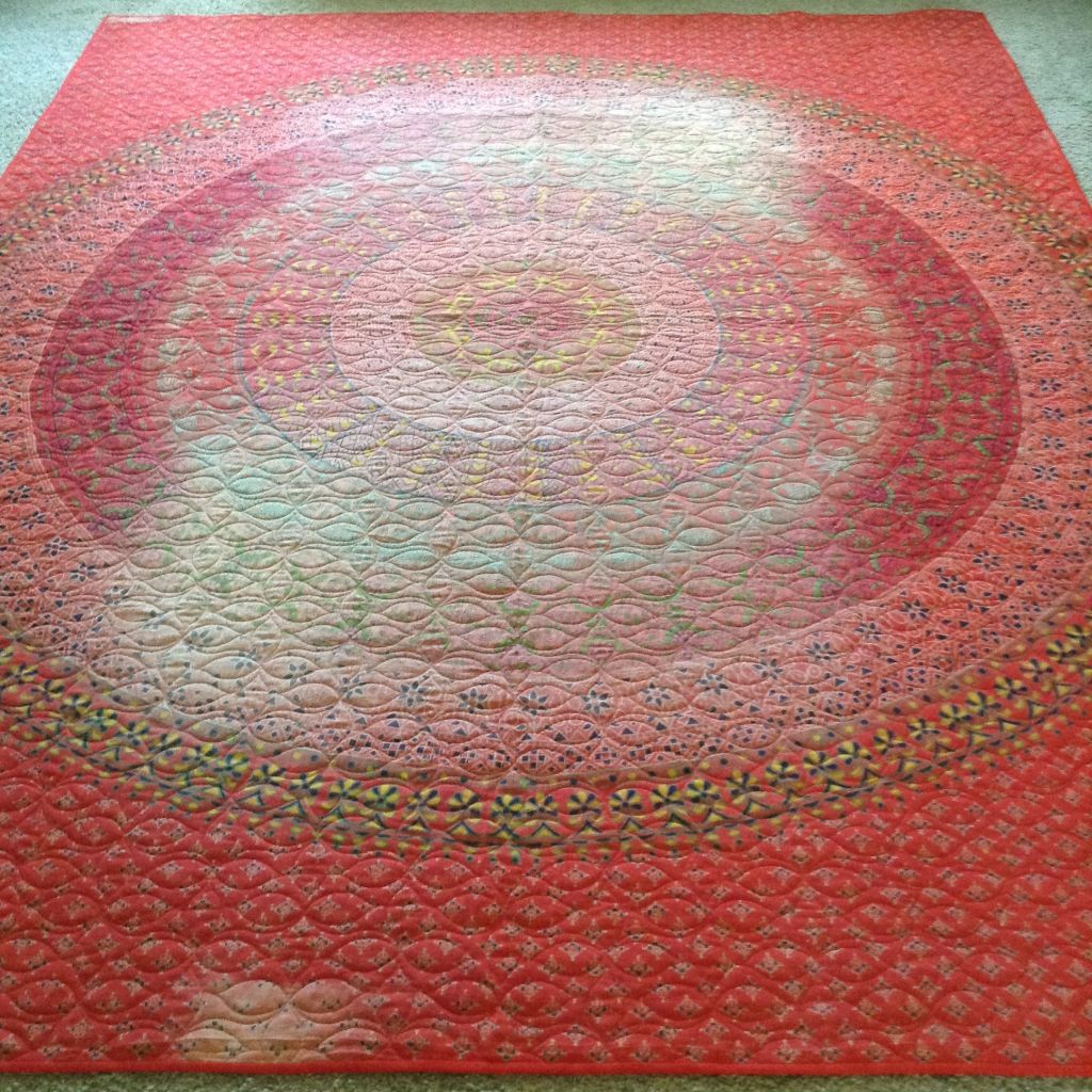 I was asked to make a quilt out of two sentimental pieces of sleeping cloth from India. Moto has had these for a while. Since she is moving back to Canada she wanted to continue to use them & have them made into a quilt. They are well loved pieces and are a cotton blend that feels like a very soft gauze fabric. We aren’t sure the fabric content but they quilted up beautifully.
