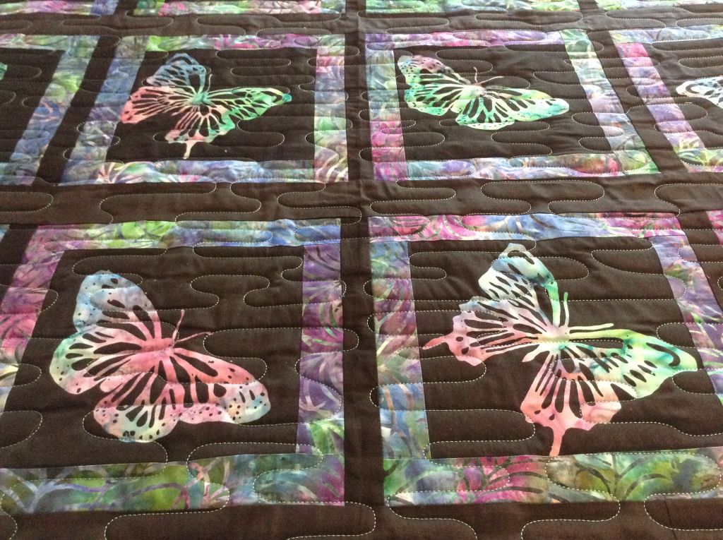 This is Deb’s Butterfly quilt. This looks so peaceful with water meander quilting is, teal thread & Hobbs 80/20 batting.