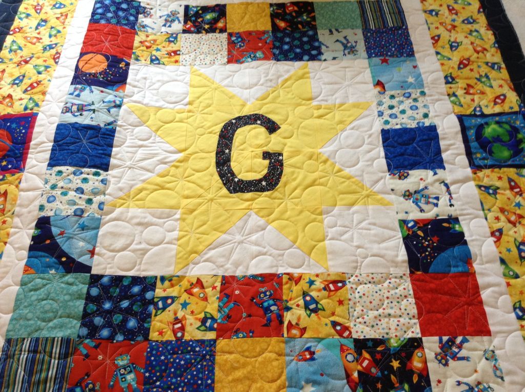 Another pattern Pam used is a variation of the Big Charm Star Quilt by MSQ’s. She personalized them with some Initials. These were also quilted with Sparkling Bubbles design. Both patterns are nice for I Spy fabrics.