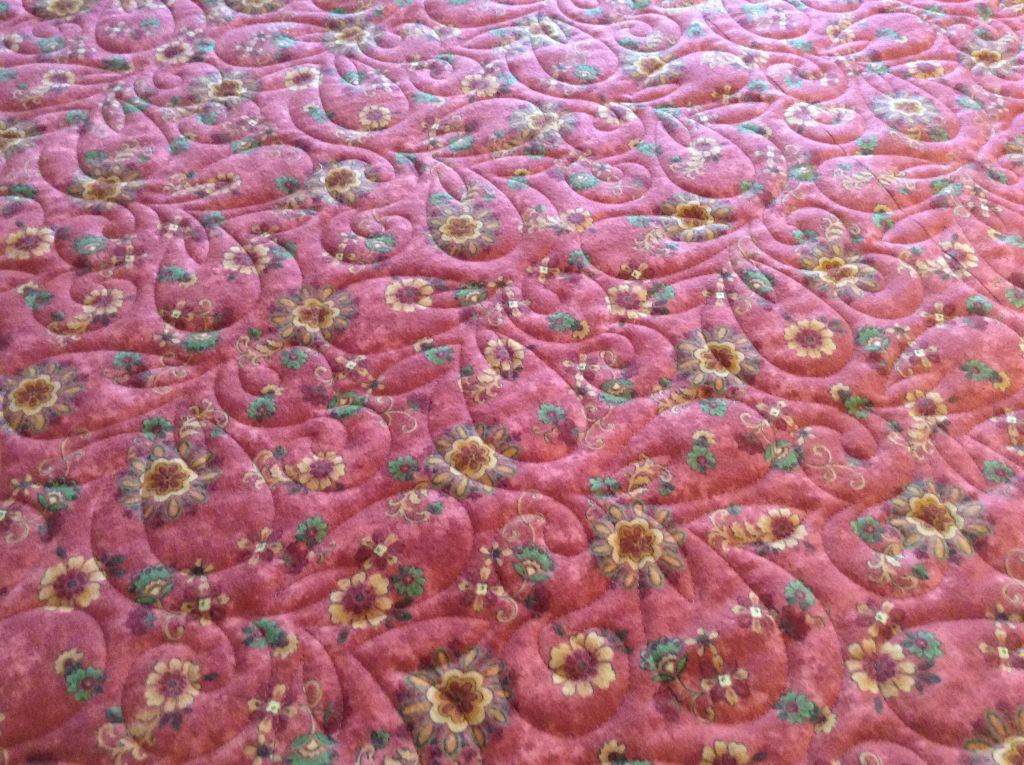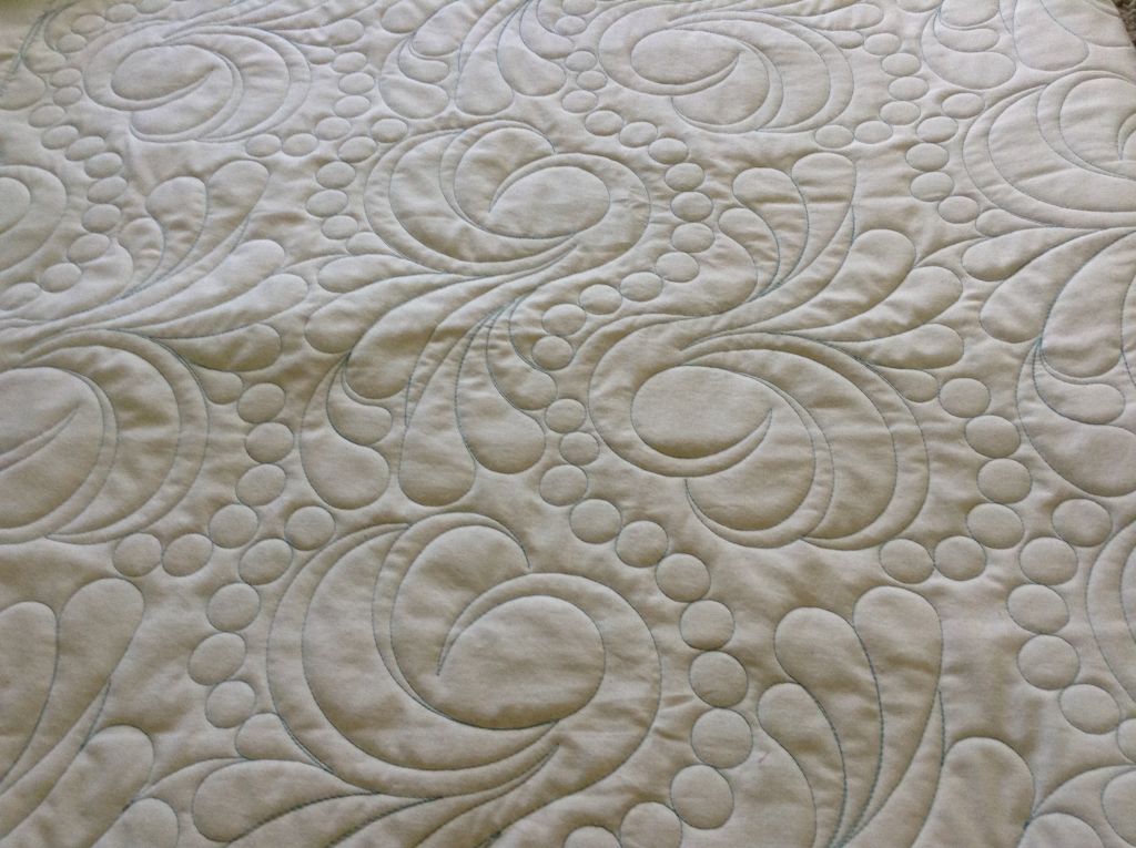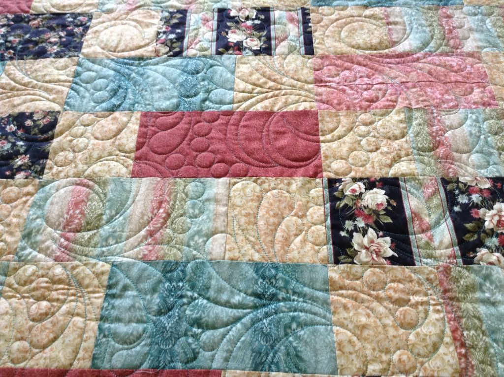 I have quilted a lot of throws this past week. These are two of Judy W’s quilts, the first has quilting design Gypsy Feathers by One Song Needle Arts. She chose a teal thread for this quilt and a muslin back. The next quilt is all musical prints for her son who is a drummer. The quilting design is called Jazz by Hermione Agee. The quilting design is a little harder to see over a busy print. We used a bright military gold color thread. The batting used for both quilts is a very light weight batting, Mountain Mist Cream Rose. The quilts were folded before taking photos so you can see that cotton battings have more of a memory than poly or wool batts.
