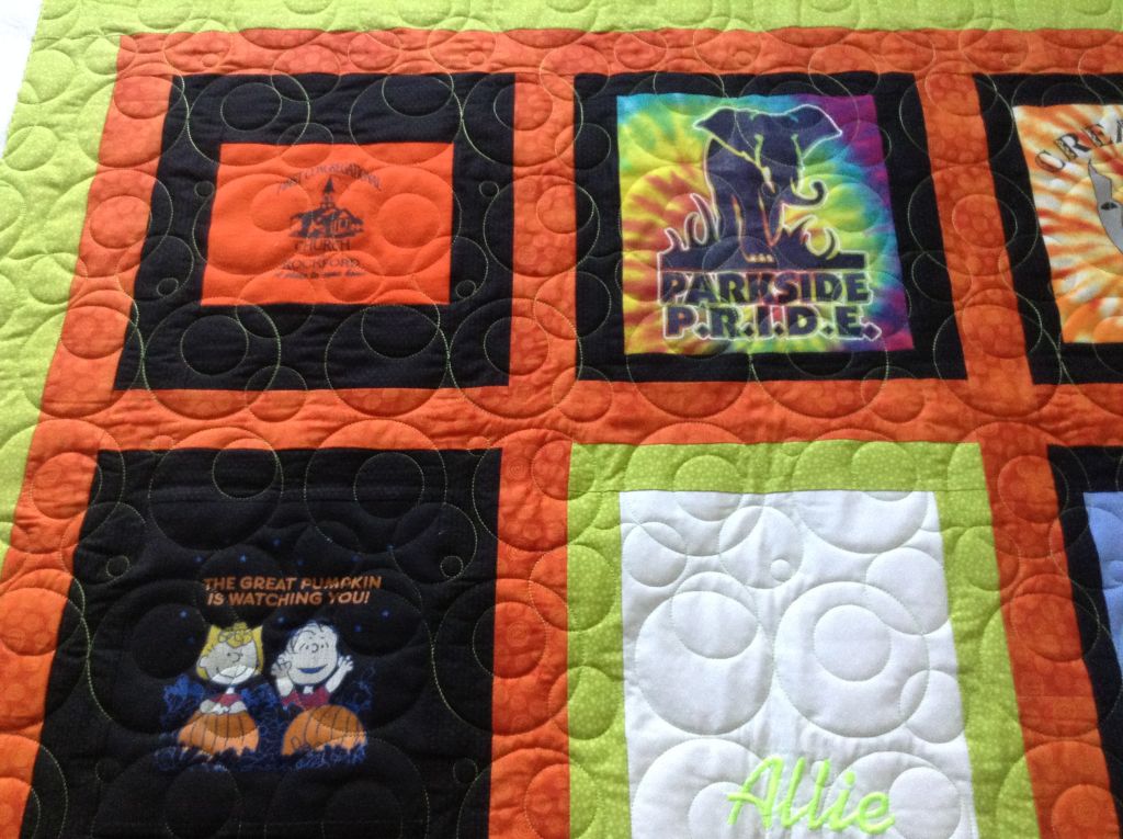 Below is a T-shirt throw quilt made by Sue V for her daughter. It’s quilted with Circle’s Panto by Judith Kraker and a lime color thread. The backing is white sateen which looks very nice with the lime thread.