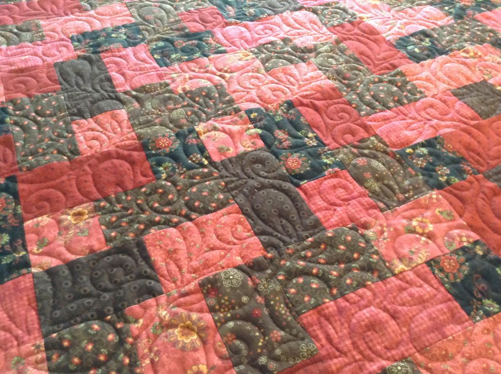 The photos below show Liz C’s flannel throw. This is a fun & fast quilt pattern called Hopscotch by The Quilt Patch Pattern Co. Liz has made several of these and they always turn out really nice. The quilt design is called Vivacious and it’s by Hermione Agee. I participated with her design club so you will see I have many of her designs in my collection. This has a pretty floral flannel backing. The batting is Hobbs 80/20. I have two more quilts finished for Liz & will have those photos in my next post.