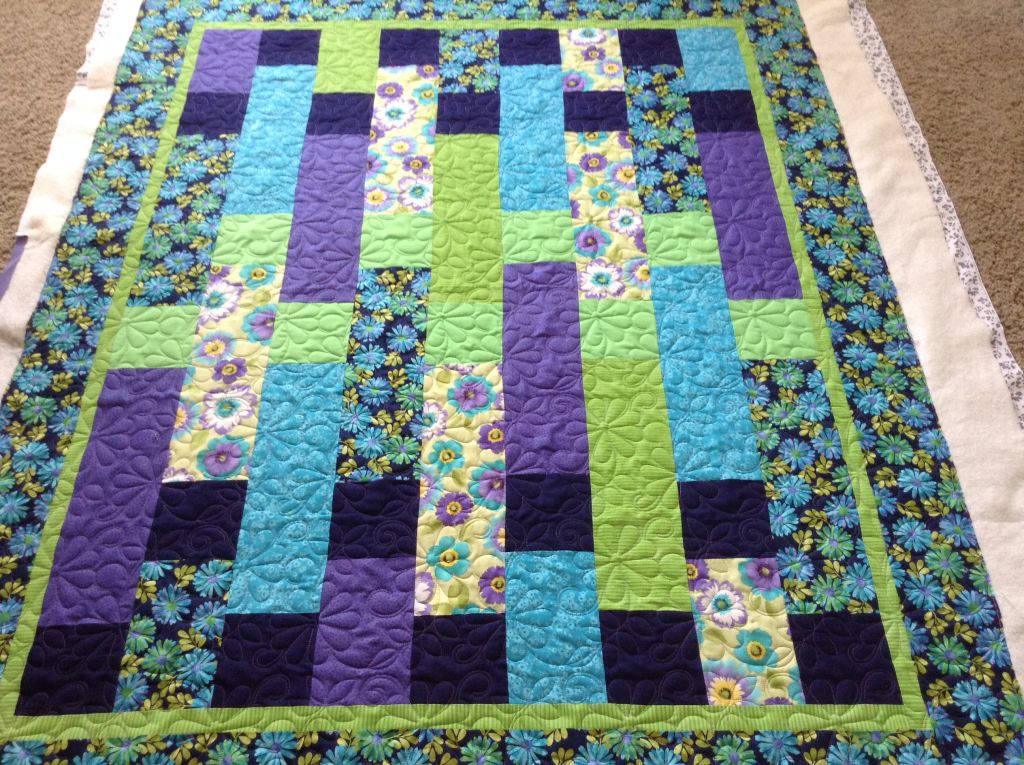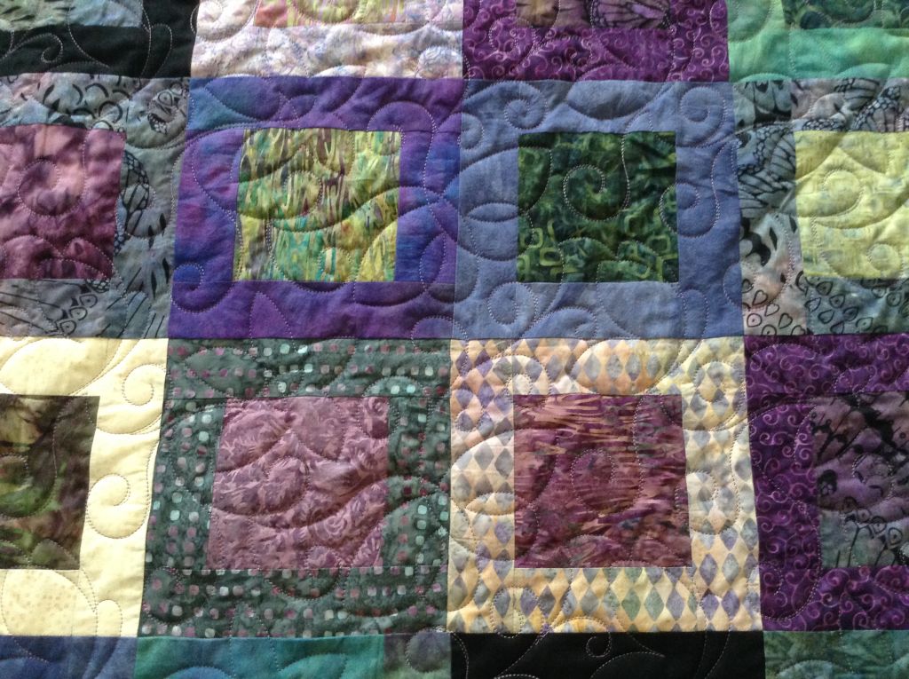 I was quilting a couple of throws for her. The first stripy quilt was quilted with Retro Flower design by Ann Bright. The second Squares quilt is quilted with Flight of Fancy by Hermione Agee. Both have Glide Wisteria color thread & Hobbs 80/20 batting.