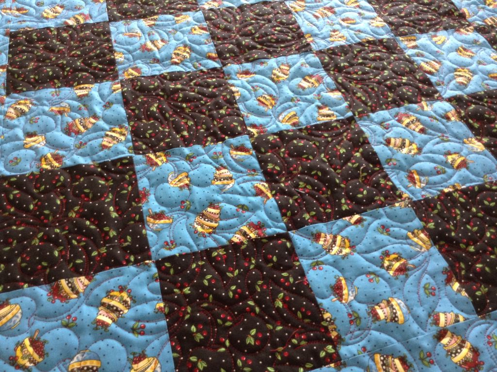 Penny B’s Cherry quilt, Cherries Jubilee quilt design by Patricia Ritter & Jessica Schick. Red thread, hobbs 80/20 batting & Minky backing.