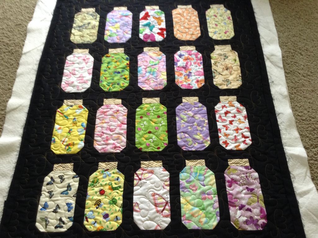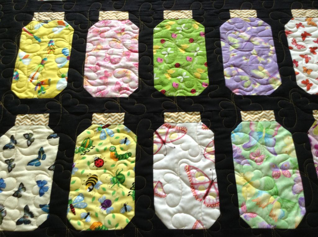 Peggy D’s Bugs in a jar quilt with Angel Wings design by Jodi Beamish. Thread is gold & batting warm & natural.