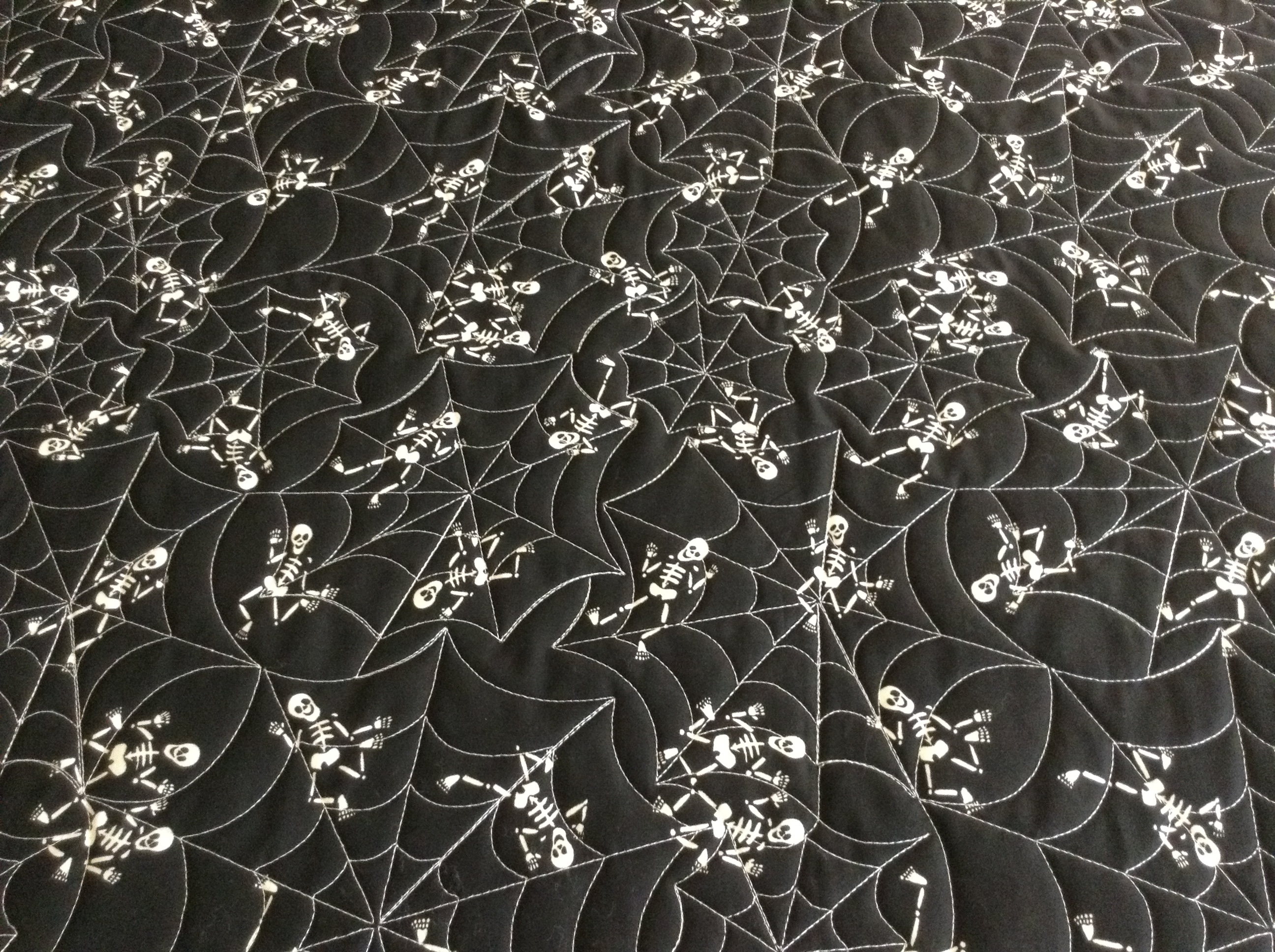 The next Halloween theme table runner has Spiderweb quilting design by Jessica Schick in white thread. The backing is the skeleton fabric.