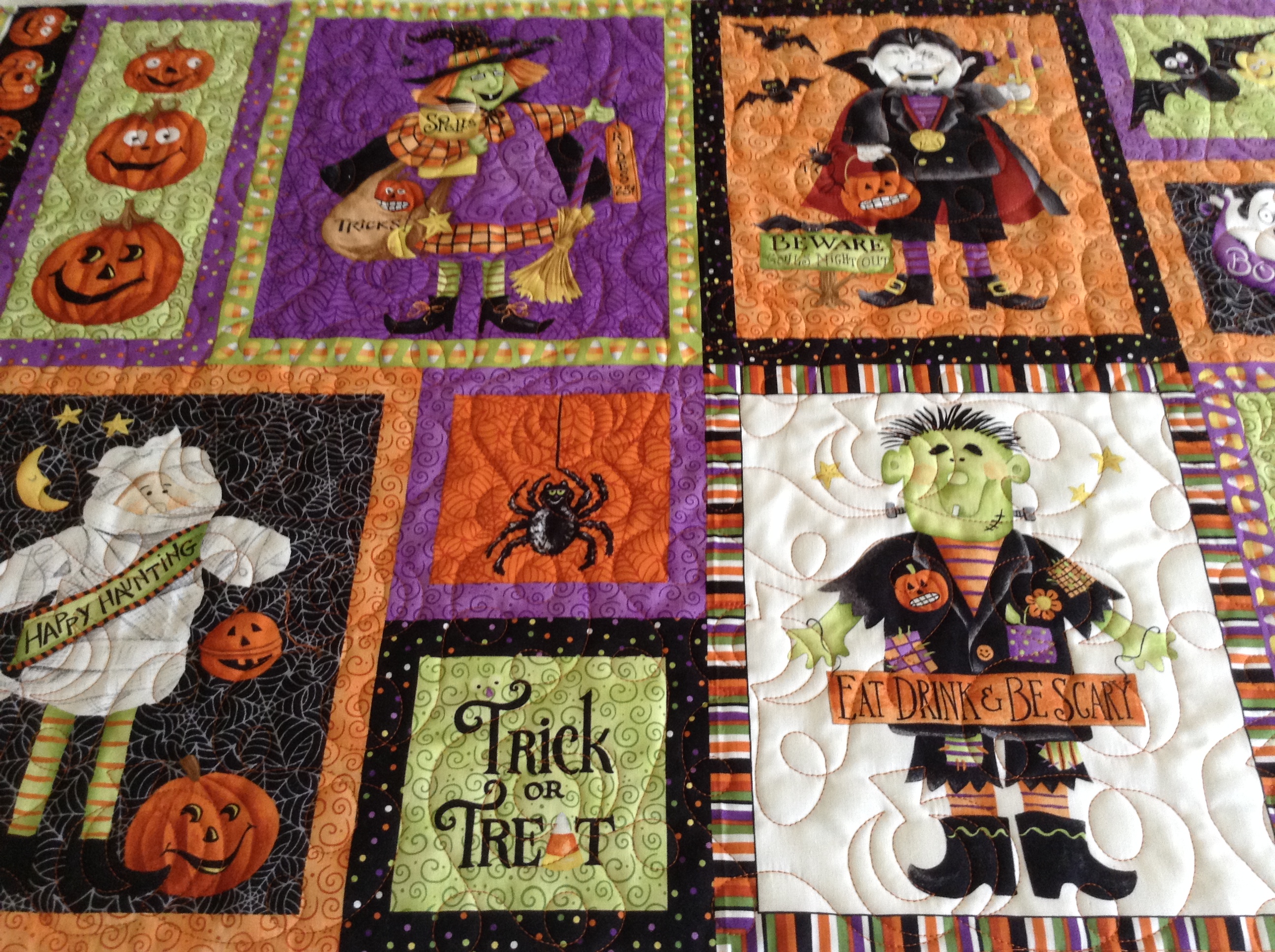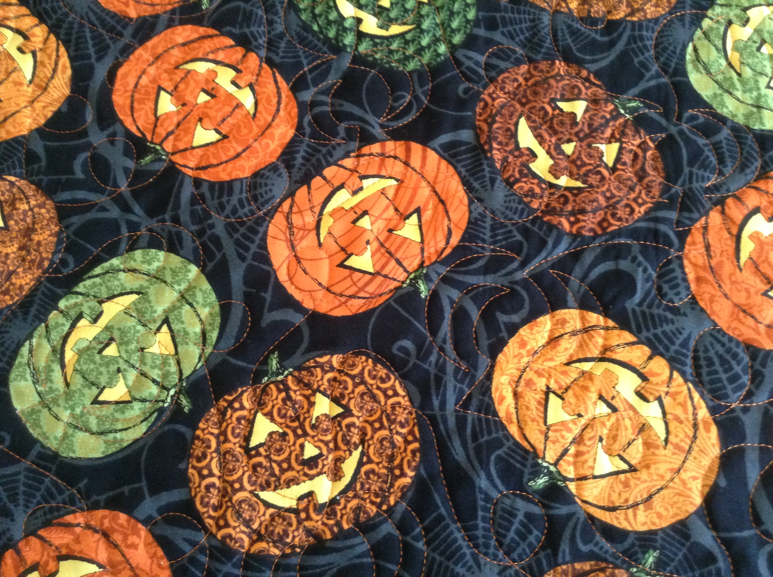 Trick or Treat table runner has Pumpkin meander by Sue Schmeiden, and orange thread. The backing is a cute pumpkin print.