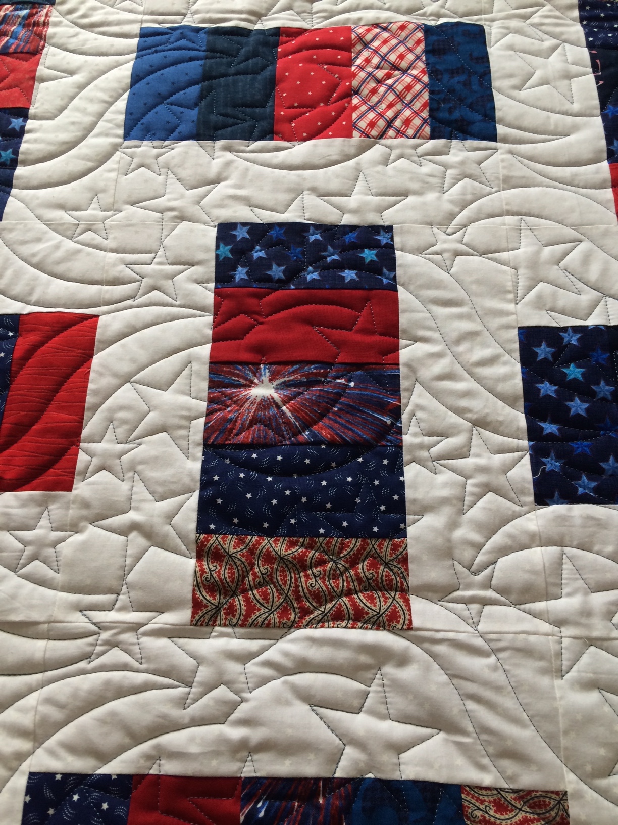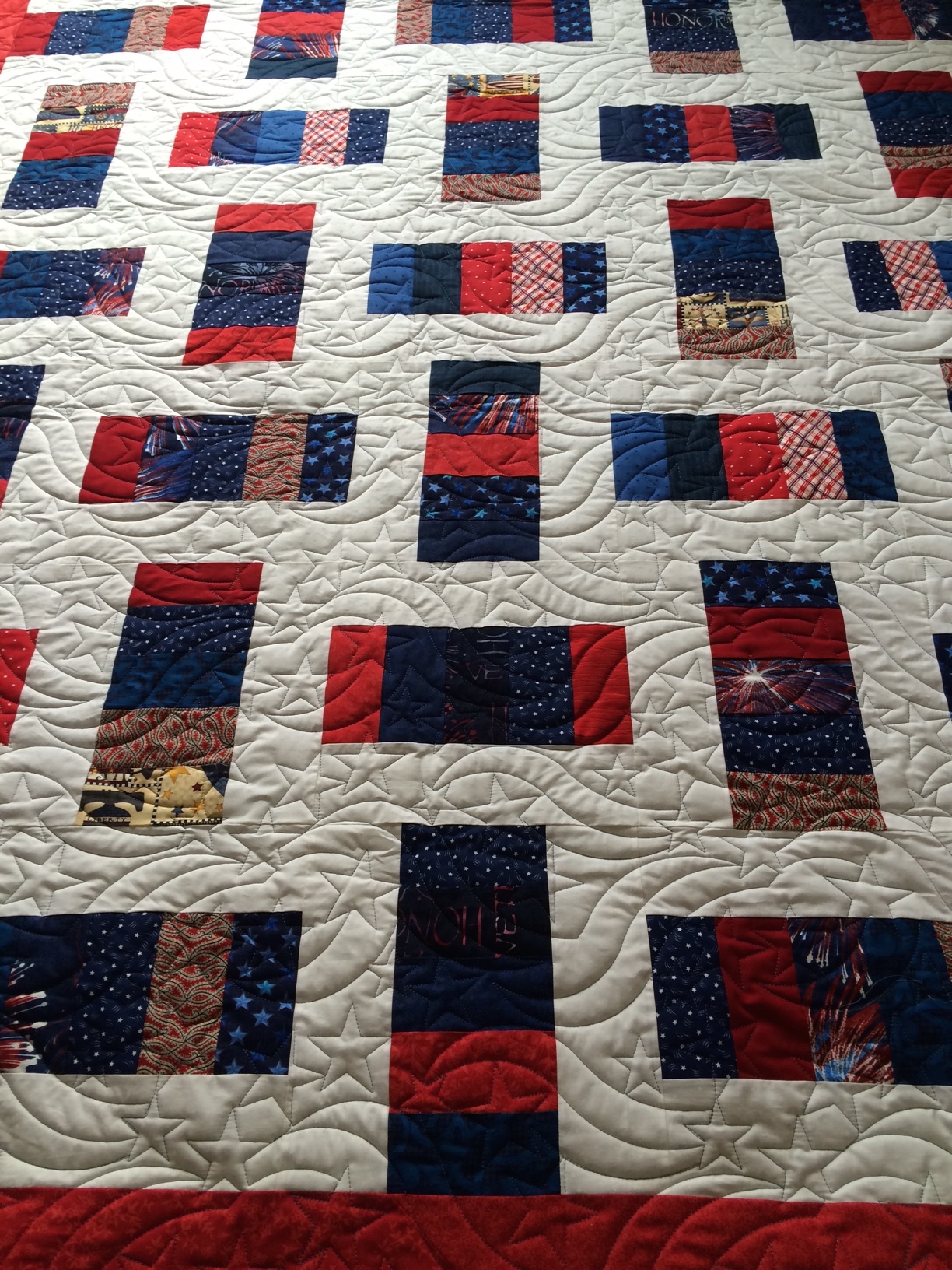 Martha made this quilt is for a veteran. The quilting design is Freedom designed by August Moon. The thread is blue & batting is Hobbs 80/20 blend. Martha used a soft plaid backing fabric.