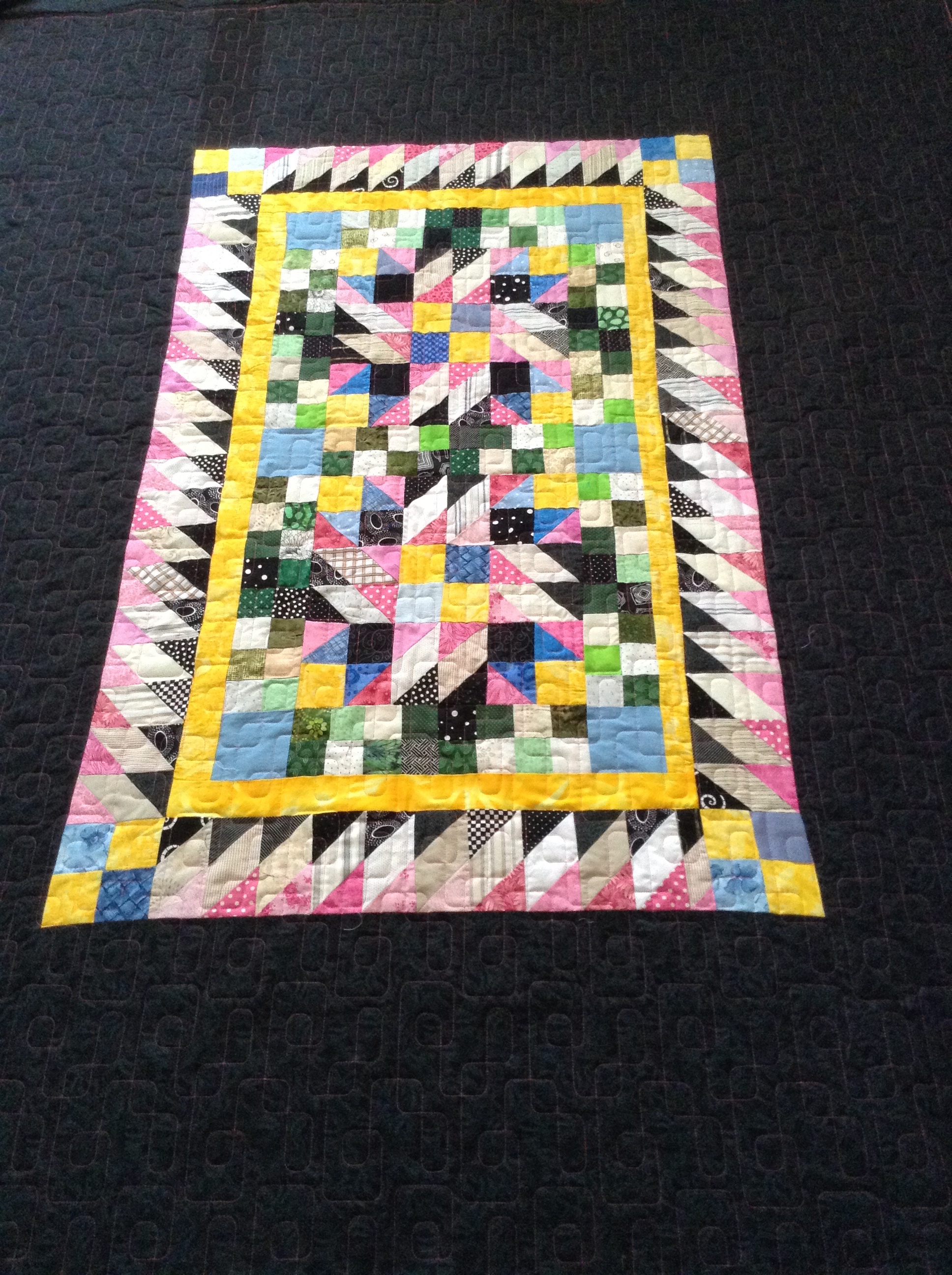 This is Amy R’s Grand Illusion quilt. This is a mystery quilt that Bonnie Hunter hosted in 2014. Its a whole lot of work and small pieces but a very pretty result. Amy decided to make the quilt smaller and use some of the squares in the back of the quilt. The quilting design is Cool Beans by Apricot Moon, Pink thread & Hobbs 80/20 batting.