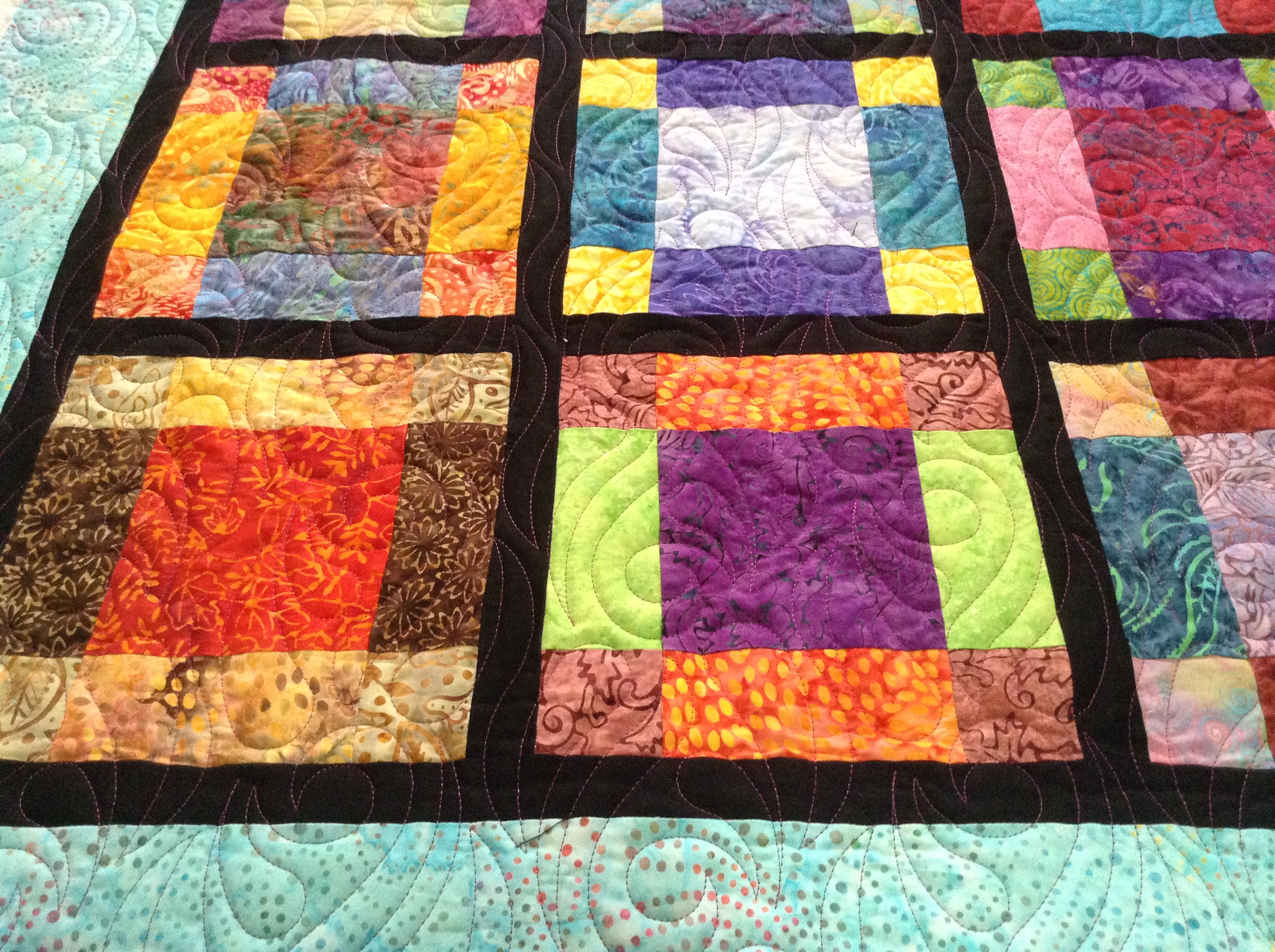 This is Roseanne L’s Bordered Squares quilt. Roseanne used beautiful batiks to make this lovely throw sized quilt. This pattern is available by tutorial at Missouri Star Quilting and uses layer cakes. Roseanne decided to mix it up a little and changed the fabric placement a little bit. The quilting design is Felicity by Christy Dillon, Hobbs 80/20 batting & Violet purple thread.