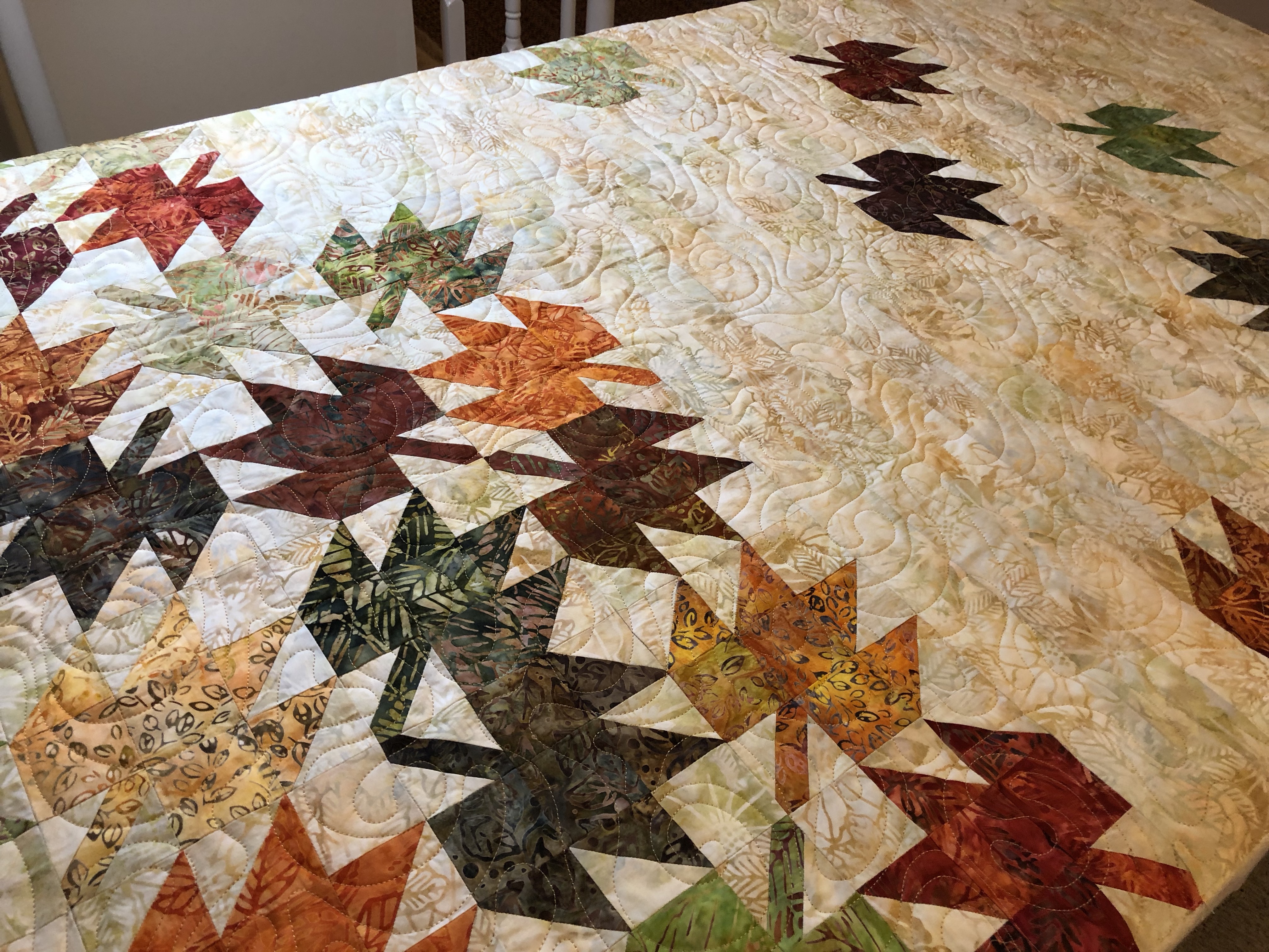 Falling Leaves Quilt Posted on February 8, 2019 by Nancy Hughson - Quilted Impressions Connie’s Falling Leaves Quilt, gold thread, Fluid Meander and Quilters Dream batting. Close up on butter color fabrics Thread over the printed leaf blocks. Soft flannel backing fabric with gold thread. Sharing seeds of kindness through quilting… Share this: Click to share on X (Opens in new window) X Click to share on Facebook (Opens in new window) Facebook Like Loading... Related