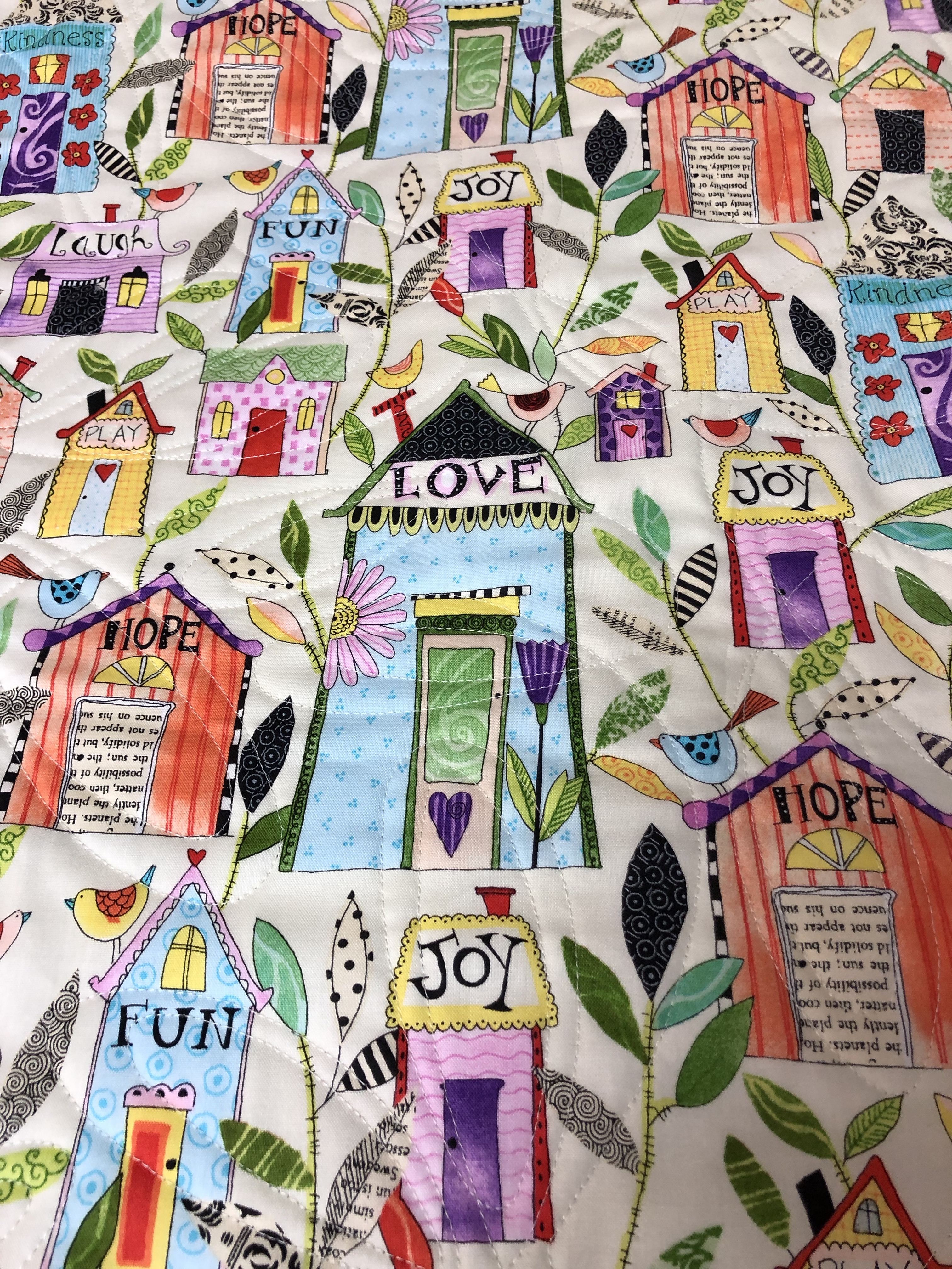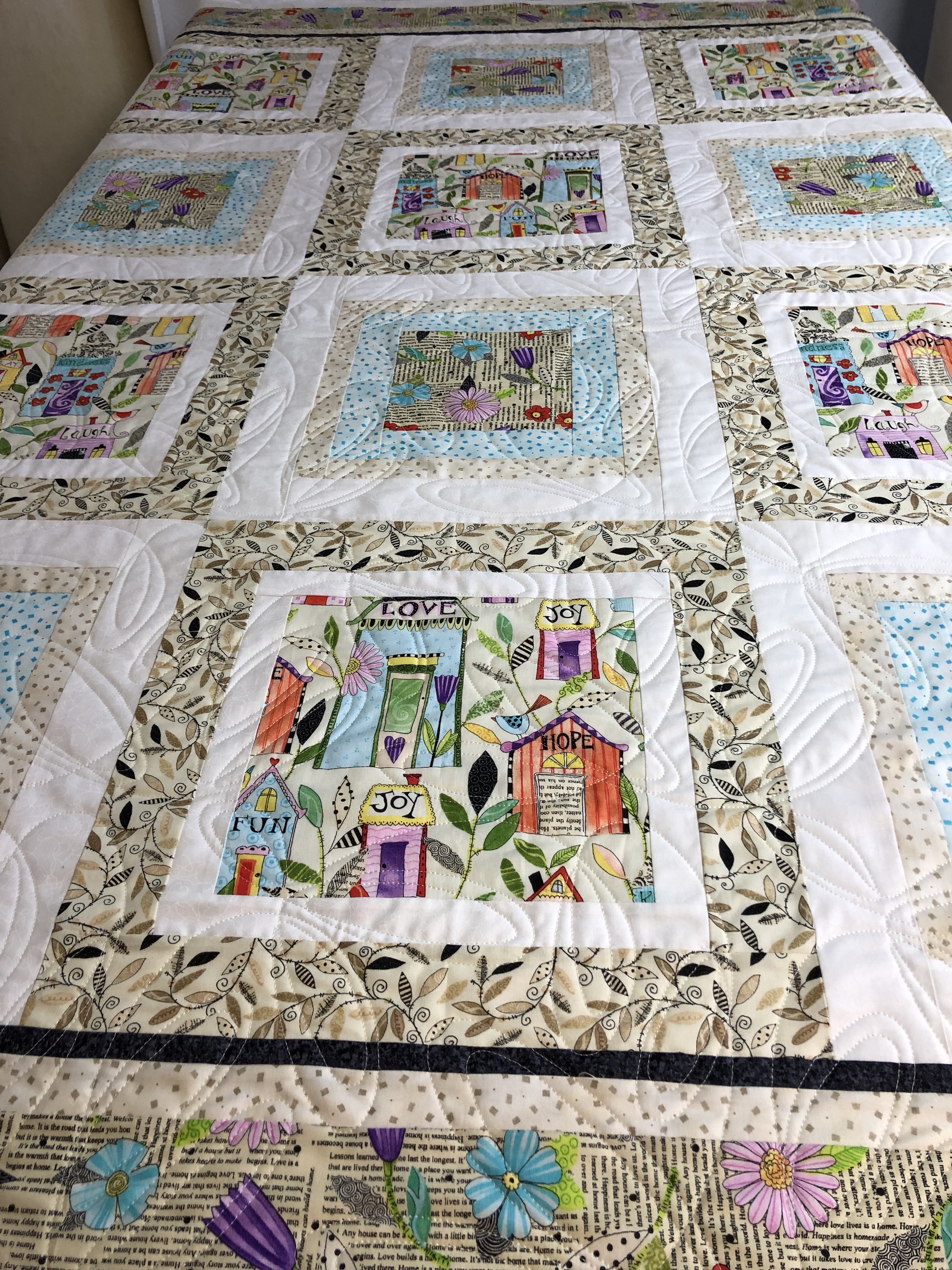Wedding Quilt Posted on March 25, 2019 by Nancy Hughson - Quilted Impressions Connie made this wedding gift quilt. The quilting design is Modern Ties B2B, Quilters dream batting and cream thread. Close up Houses on the back of the quilt. Share this: Click to share on X (Opens in new window) X Click to share on Facebook (Opens in new window) Facebook Like Loading... Related