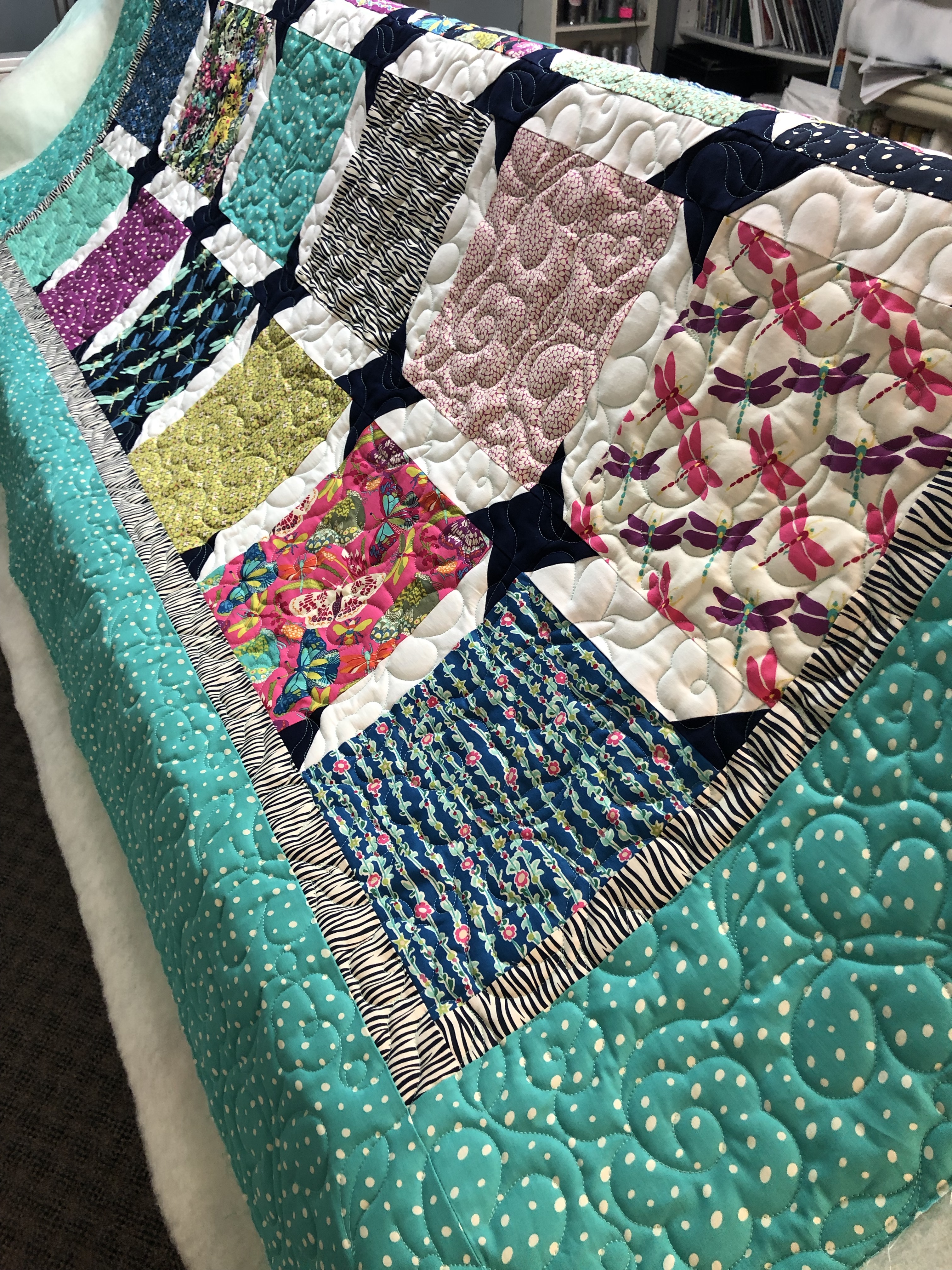 Butterfly Dance Quilt Posted on March 28, 2019 by Nancy Hughson - Quilted Impressions Kaitlins Butterfly Dance quilt. Mayflowers allover design with Teal thread & Wool batting. Close up Quilt back Share this: Click to share on X (Opens in new window) X Click to share on Facebook (Opens in new window) Facebook Like Loading... Related