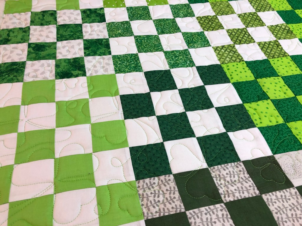 The Alphabet Redwork quilt has a wide rickrack attached so I basted the tips of the rick rack down so they wouldn’t flip and the basting can be removed now that the quilting is finished. The quilting design is Simple B2B ( a simple loop design), cream thread & she provided the batting. The cornerstones are string pieced. Her second quilt is a Winter quilt with red stars. If you can look close, there are deer in the light blue fabric. The fabrics are winter prints. The quilting design is Winter Wonderland, silver blue thread & she provided the batting. Her last quilt is 16 patch blocks done in shades of green. The quilting design is Shamrocks, the thread is lime green & she provided batting so I’m not exactly sure what brand but was nice quality.
