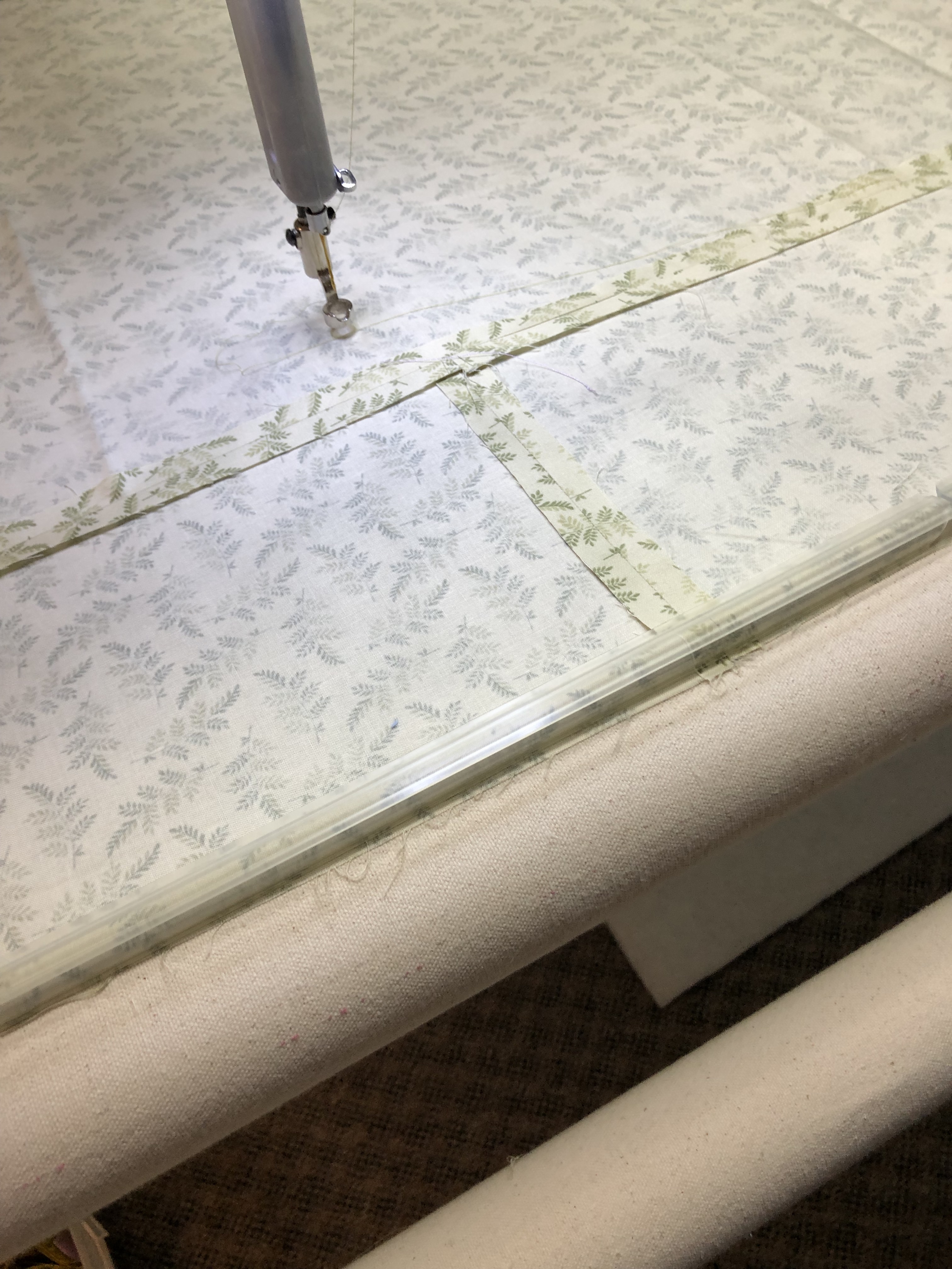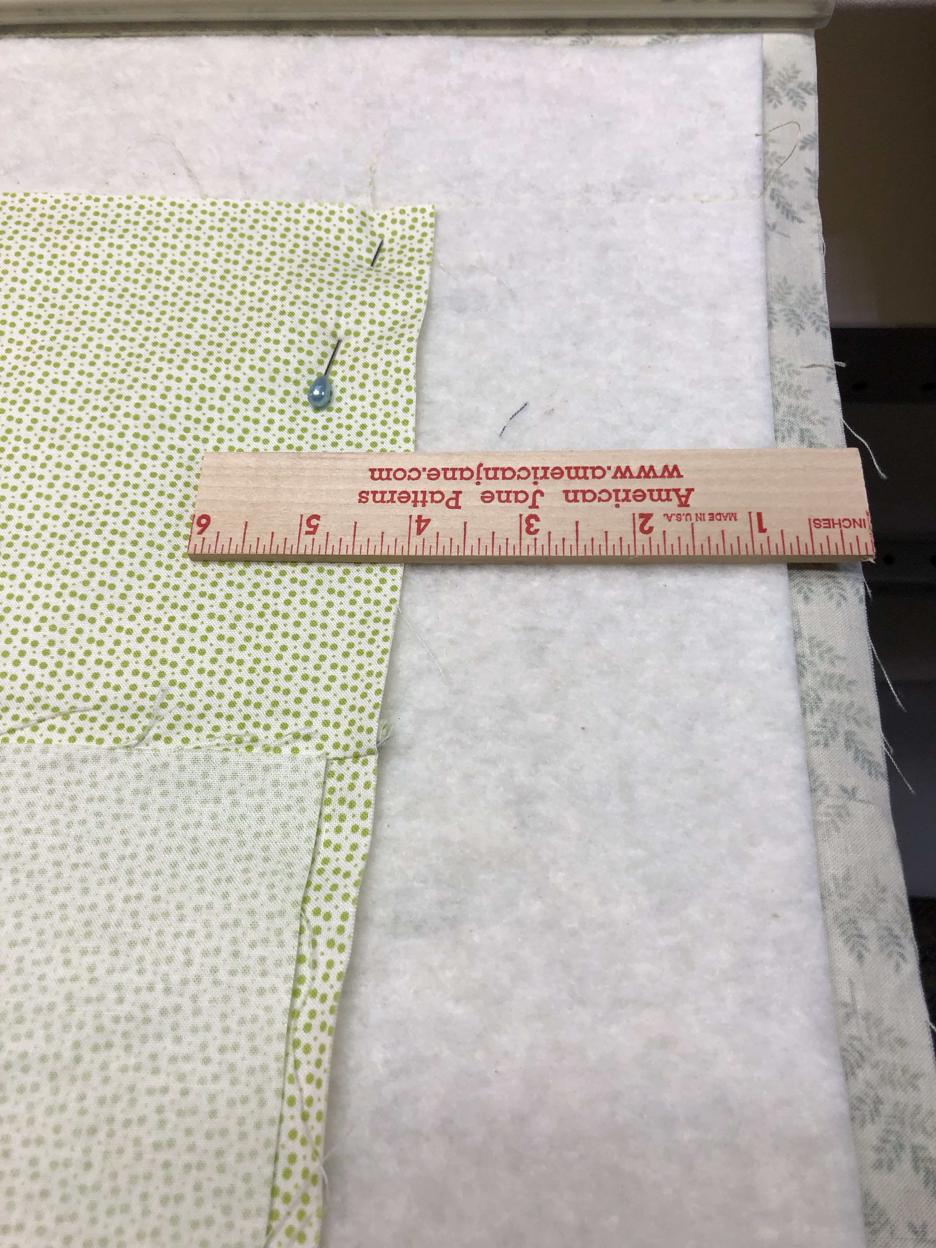 Next I lay the batting on the quilt back. When I measure batting I make it about an inch smaller than the quilt back so I can see the edge of the backing fabric when clamping and advancing the quilt. Notice she has given me the 4″ I asked for. I prefer the backs be no less than 4″ and no greater than 6″ on each side. This helps me know how you want the quilt centered. If you prepare it this way there is less a chance for error in centering or having the back turned. I baste the batting with a horizontal line which should be about 3″ down from the leader now because 1″ is wrapped into the leader grip.