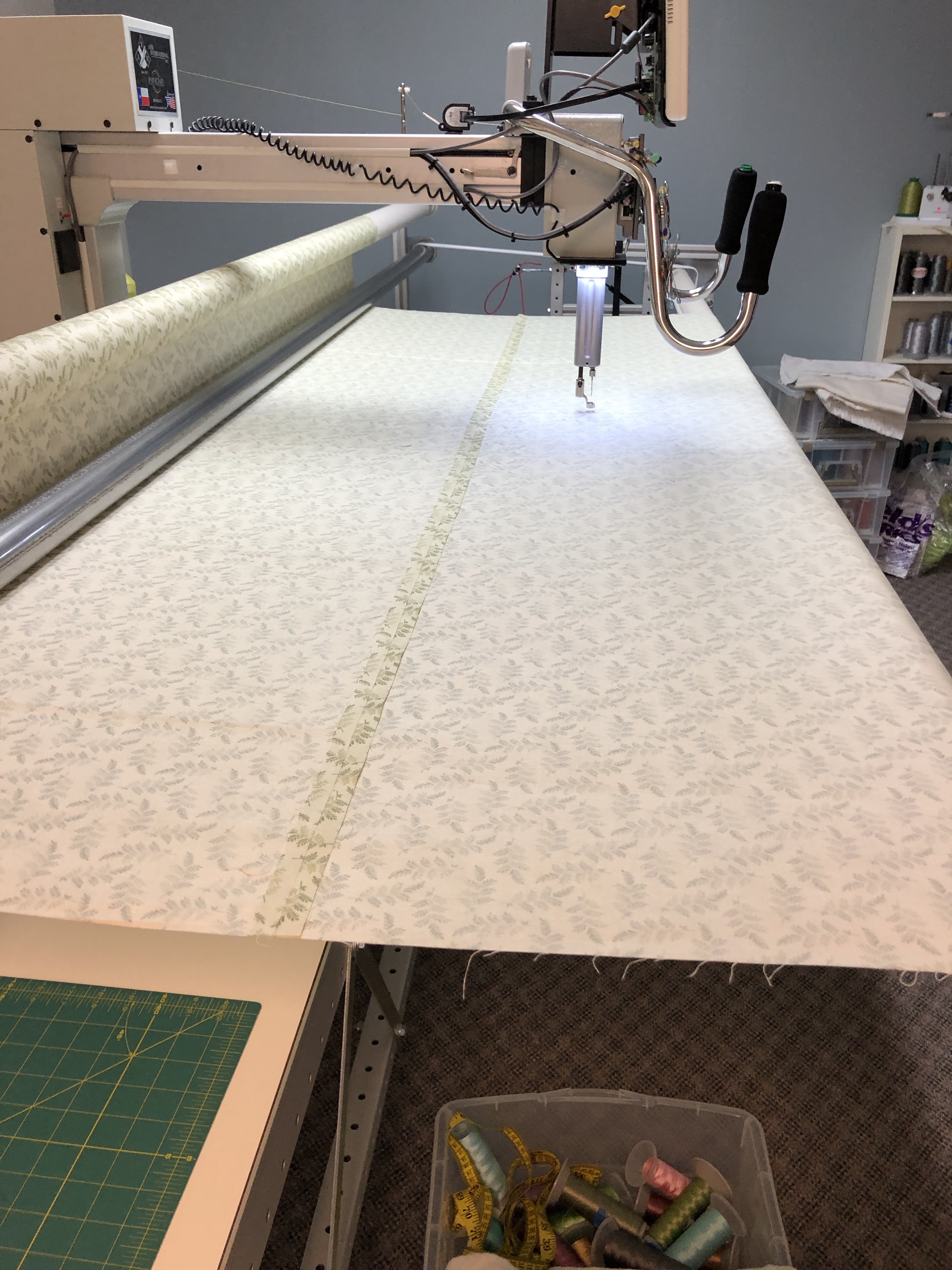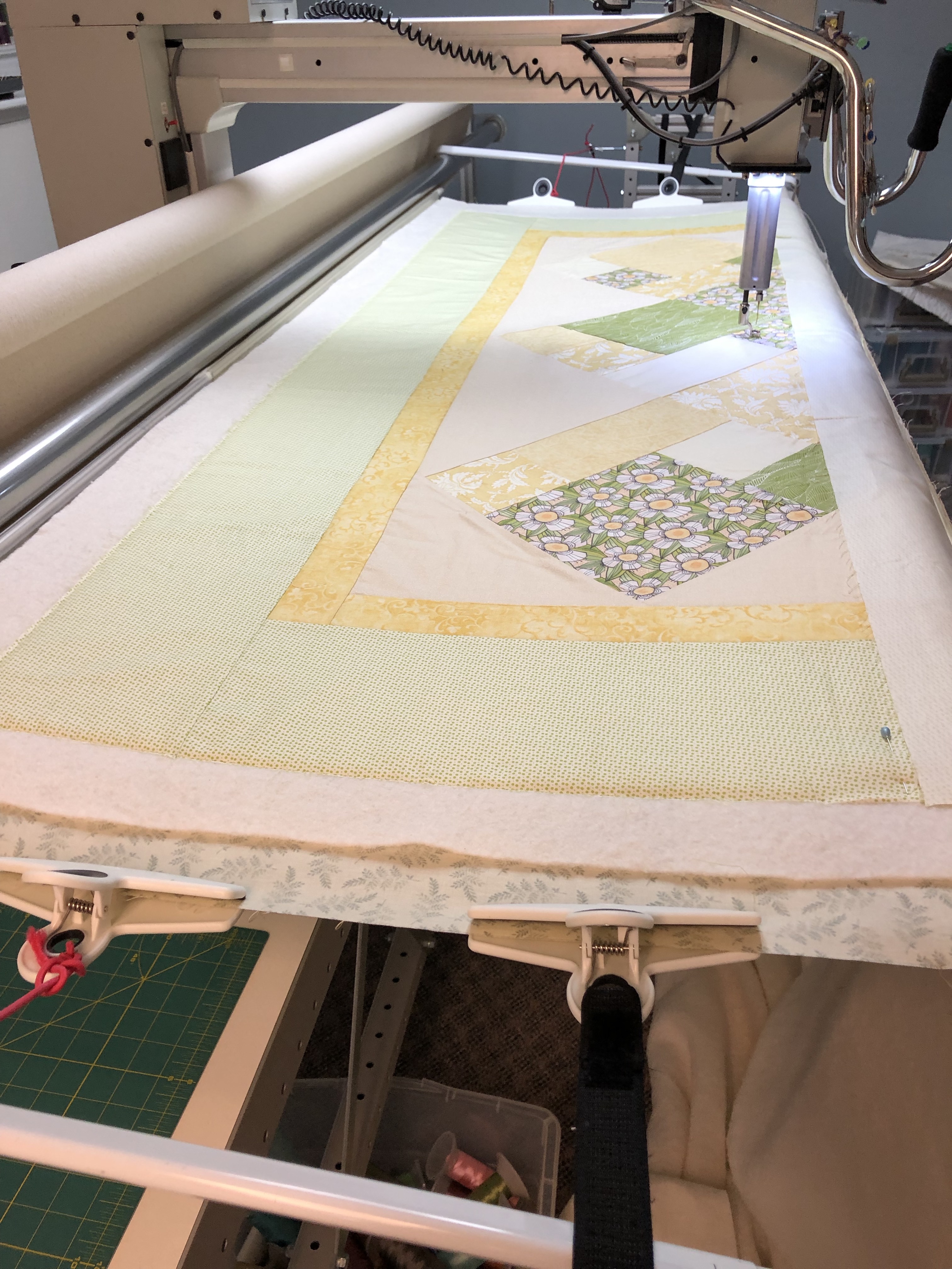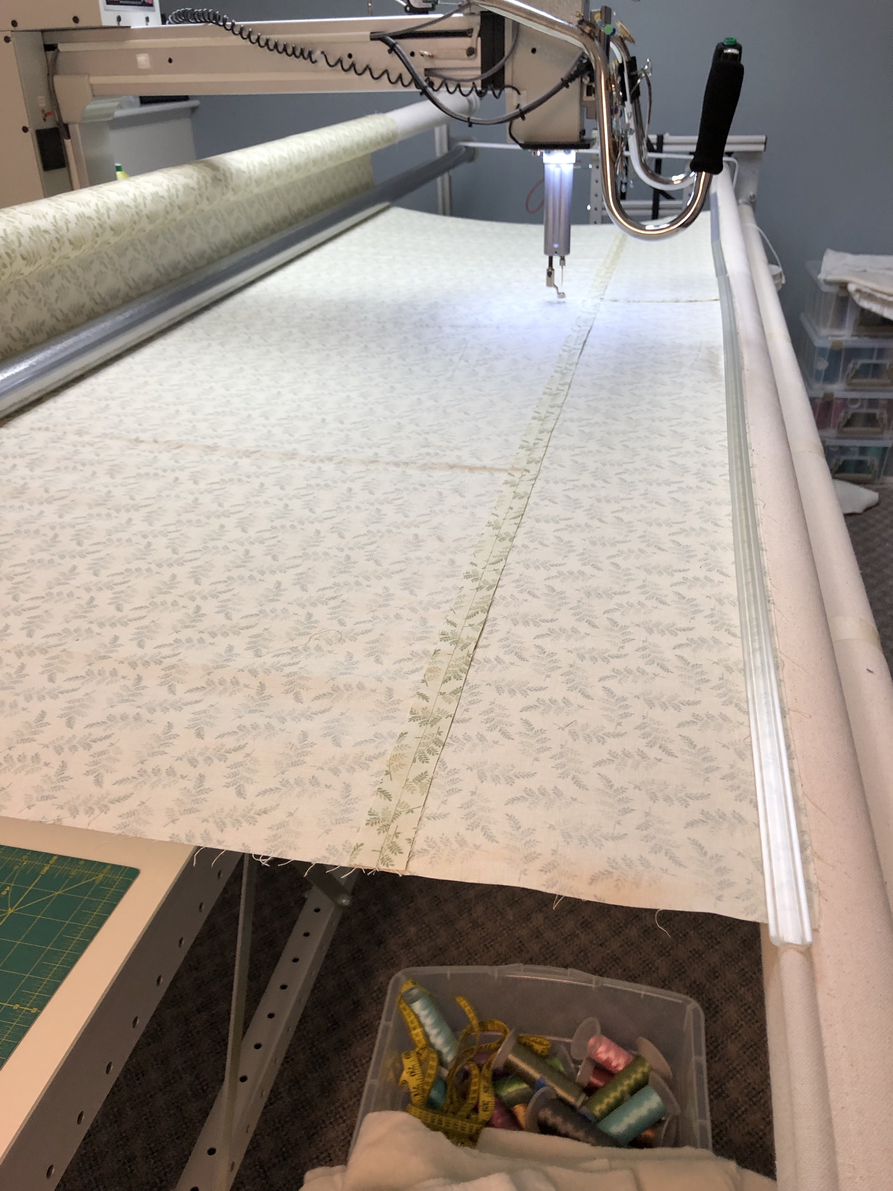 Next I lay the quilt top over the batting right side up. I can easily line up the top edge of the border to the stitched line and make sure its centered properly. I should have at least 4″ of quilt back on both sides now. Once in place I pin it and baste the top. I’ll advance the quilt, smooth and position it then baste along the sides. I full float the quilt top and fold up the bottom portion to get it off the floor and keep it pressed.
