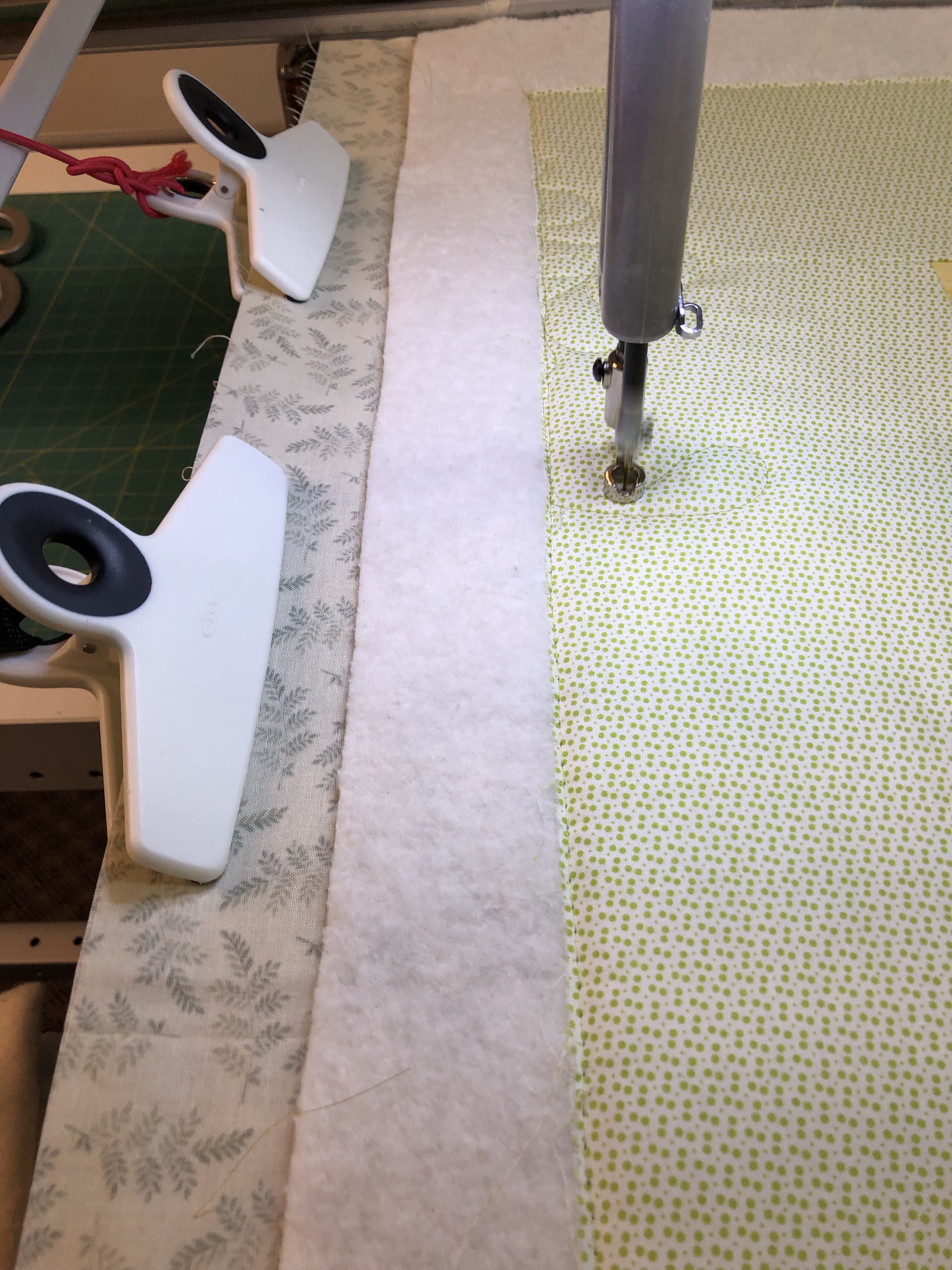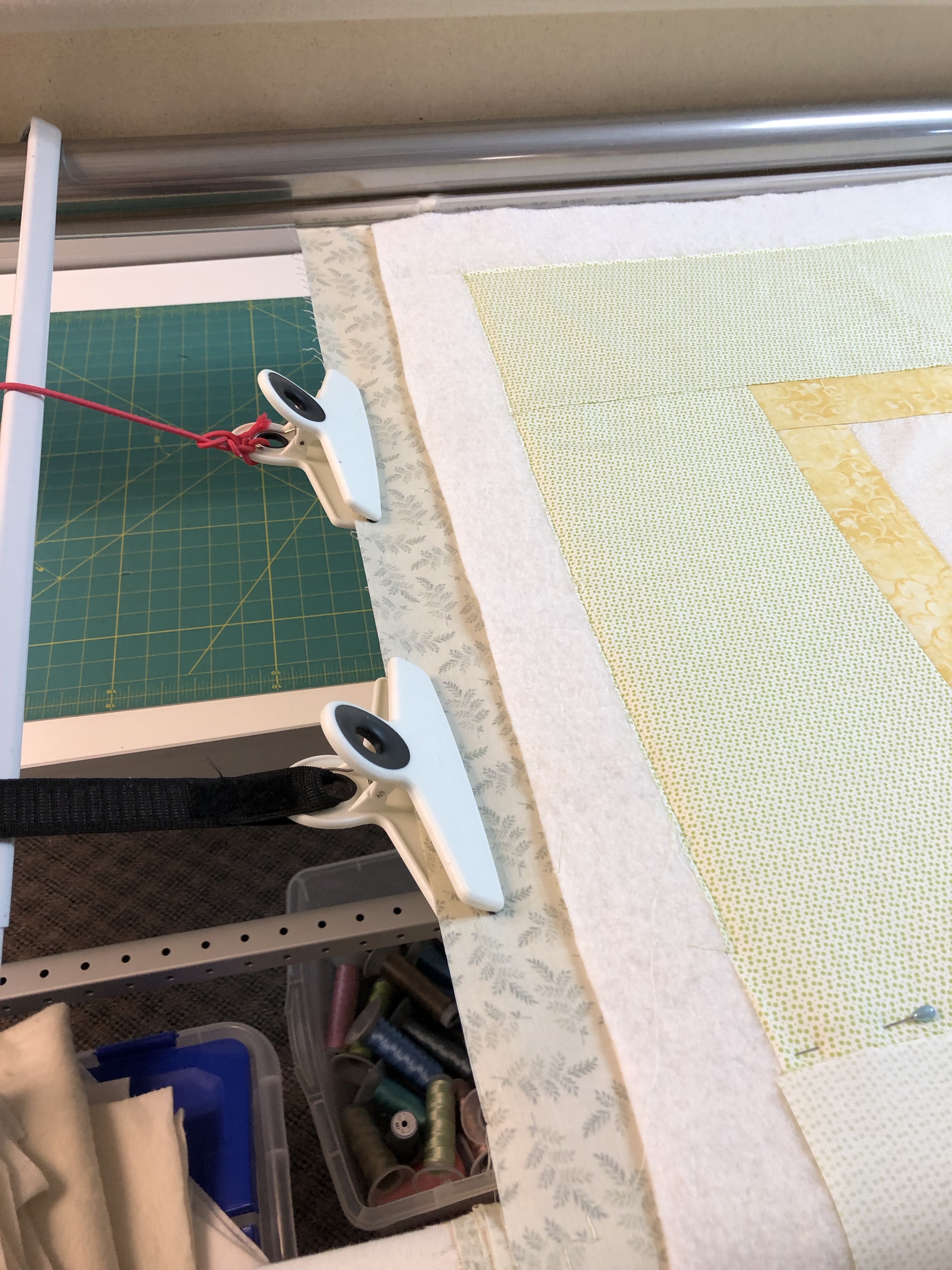 The curtain hangers keep the clamps from pulling down on the sides. The extra fabric on the sides allows my machine to move to the edge without getting hung up on the clamps. Thats why I need 4″ and no less. This is how a quilt should look when loaded.
