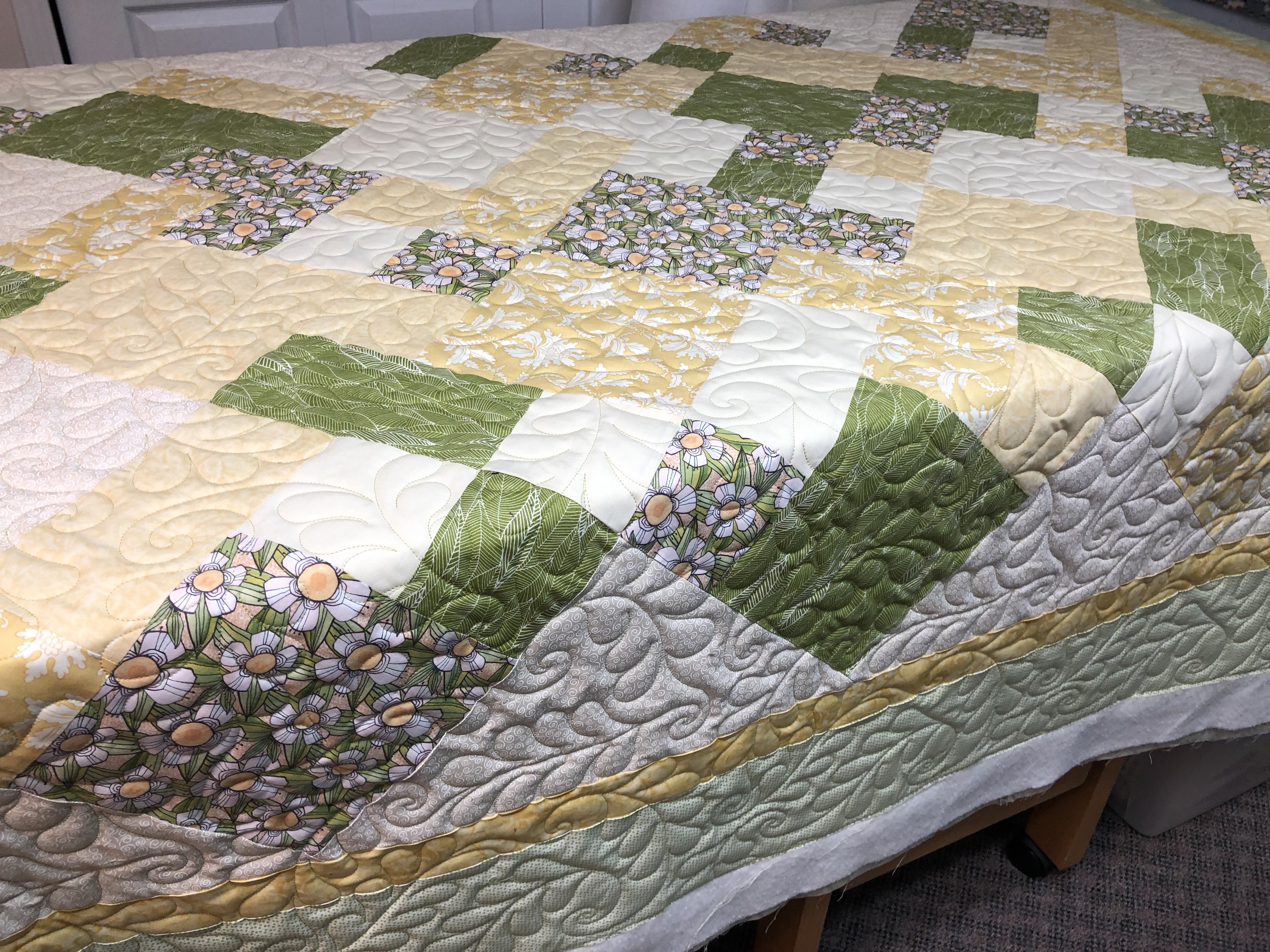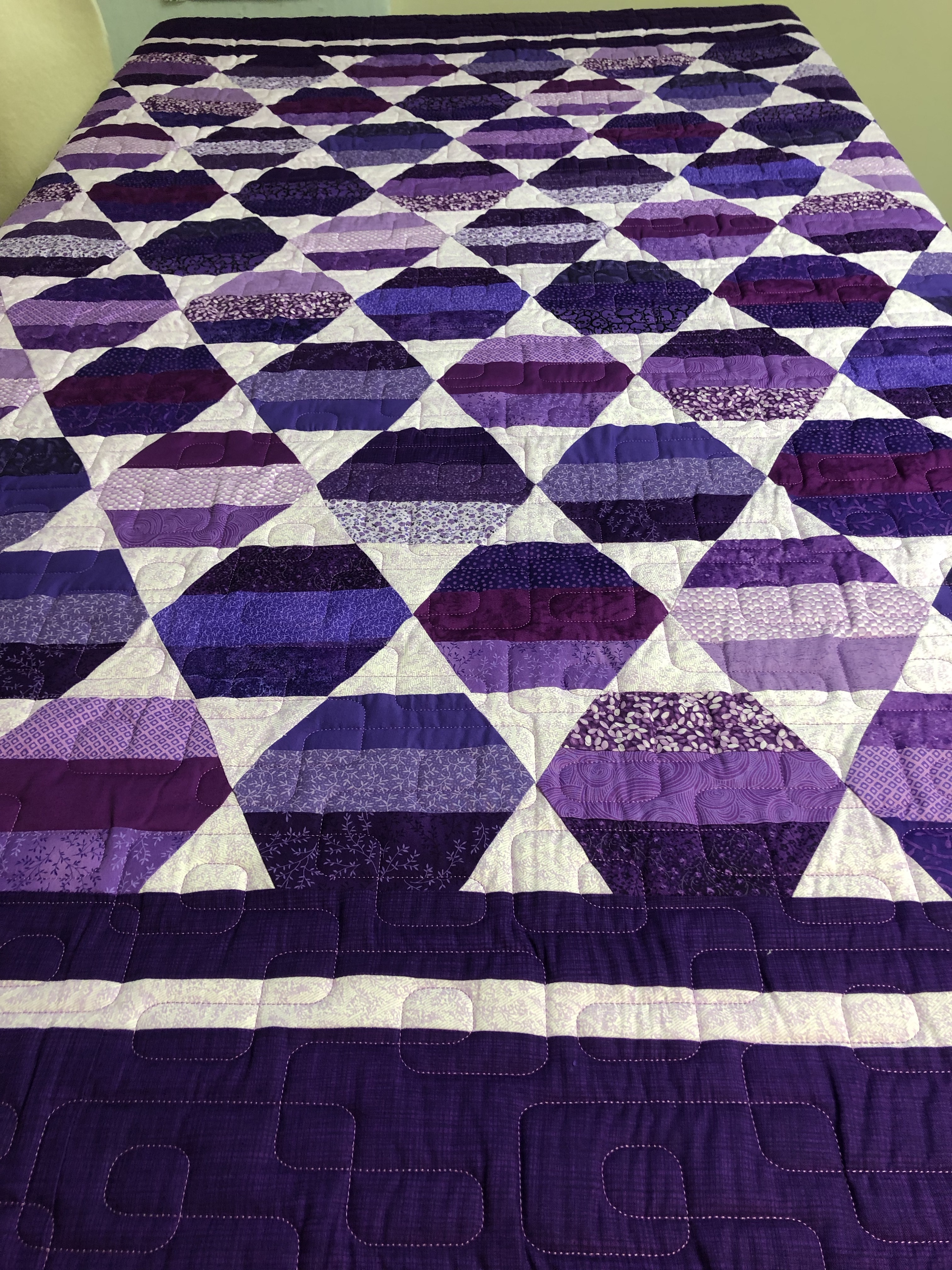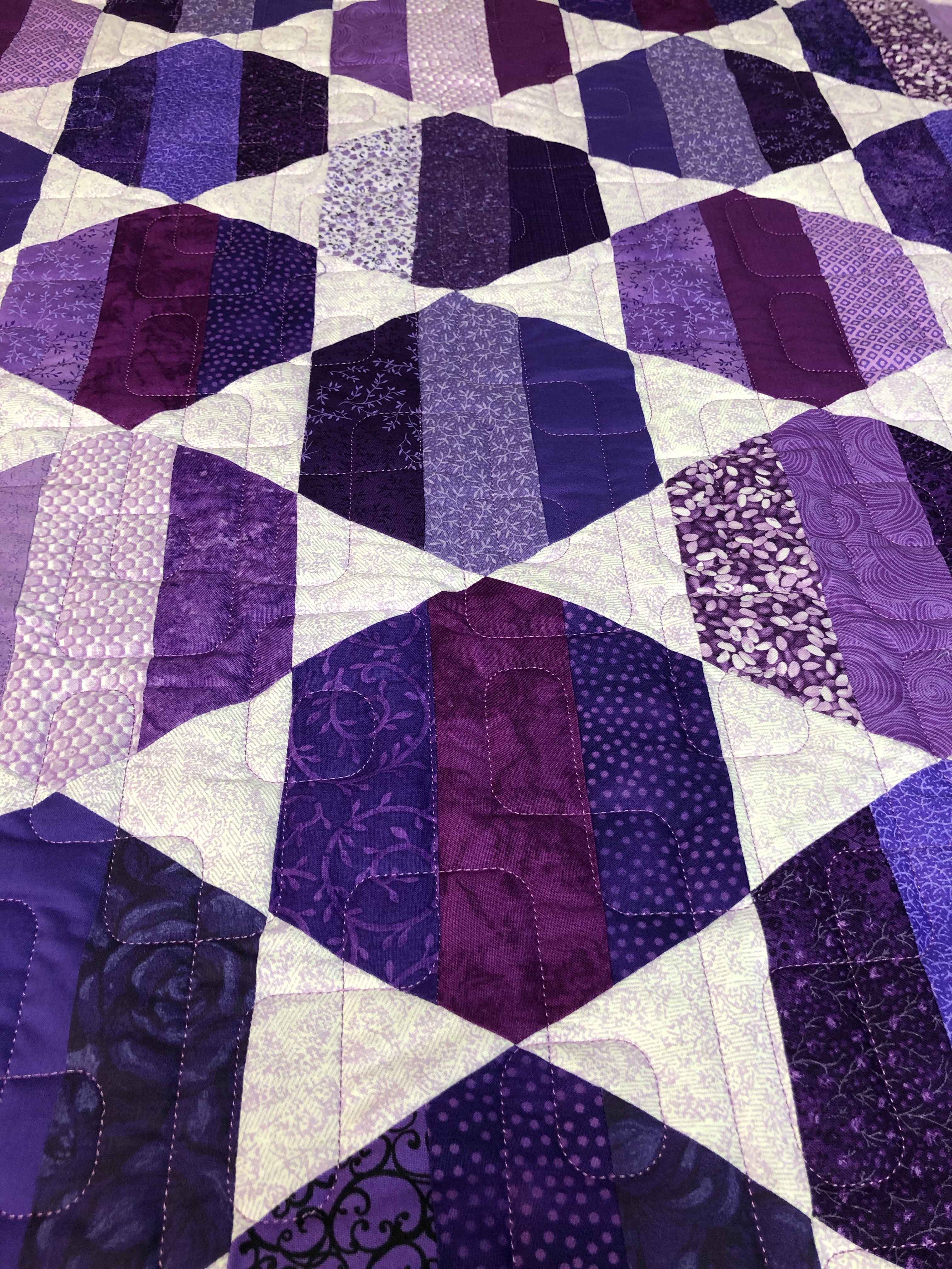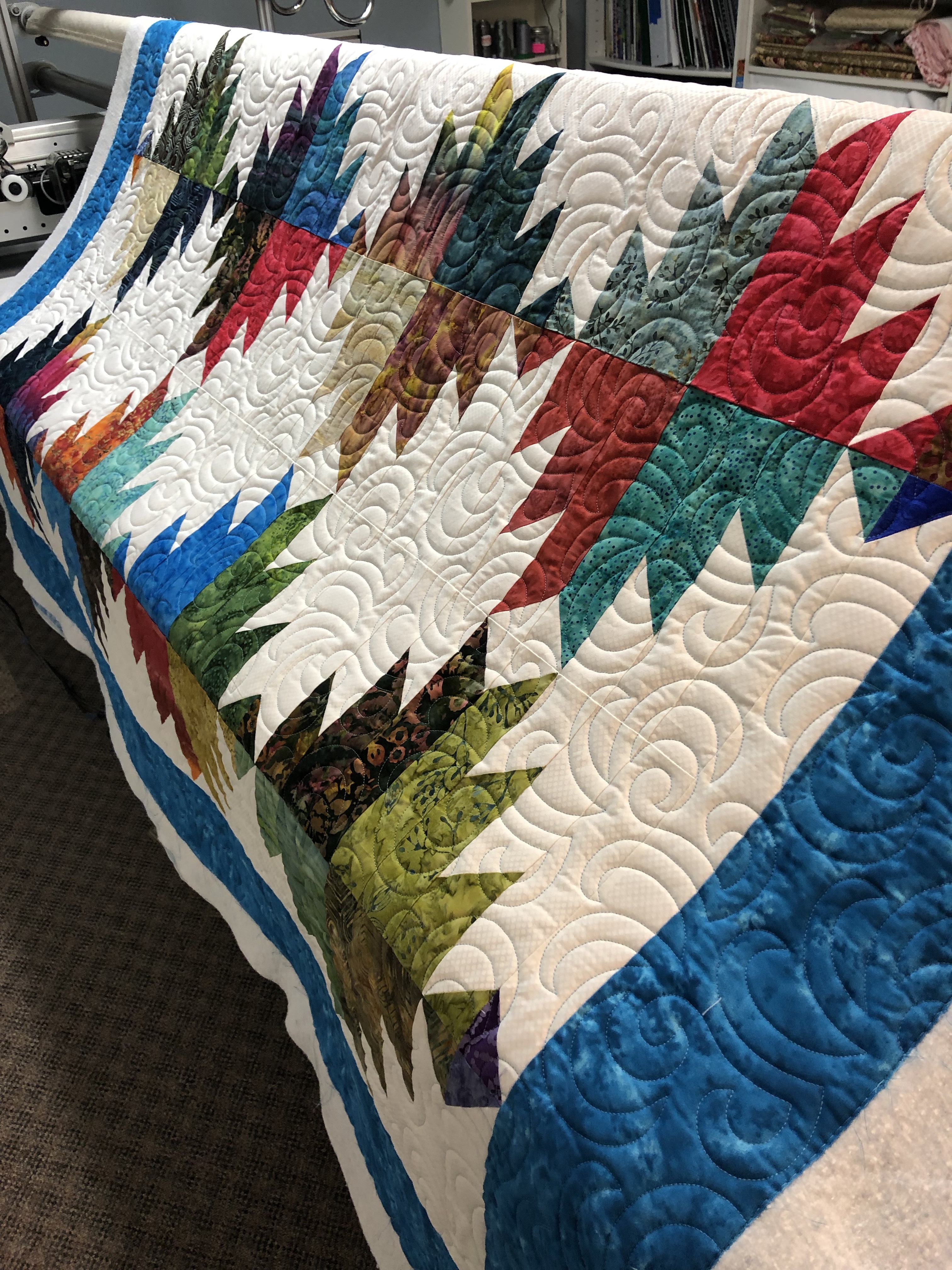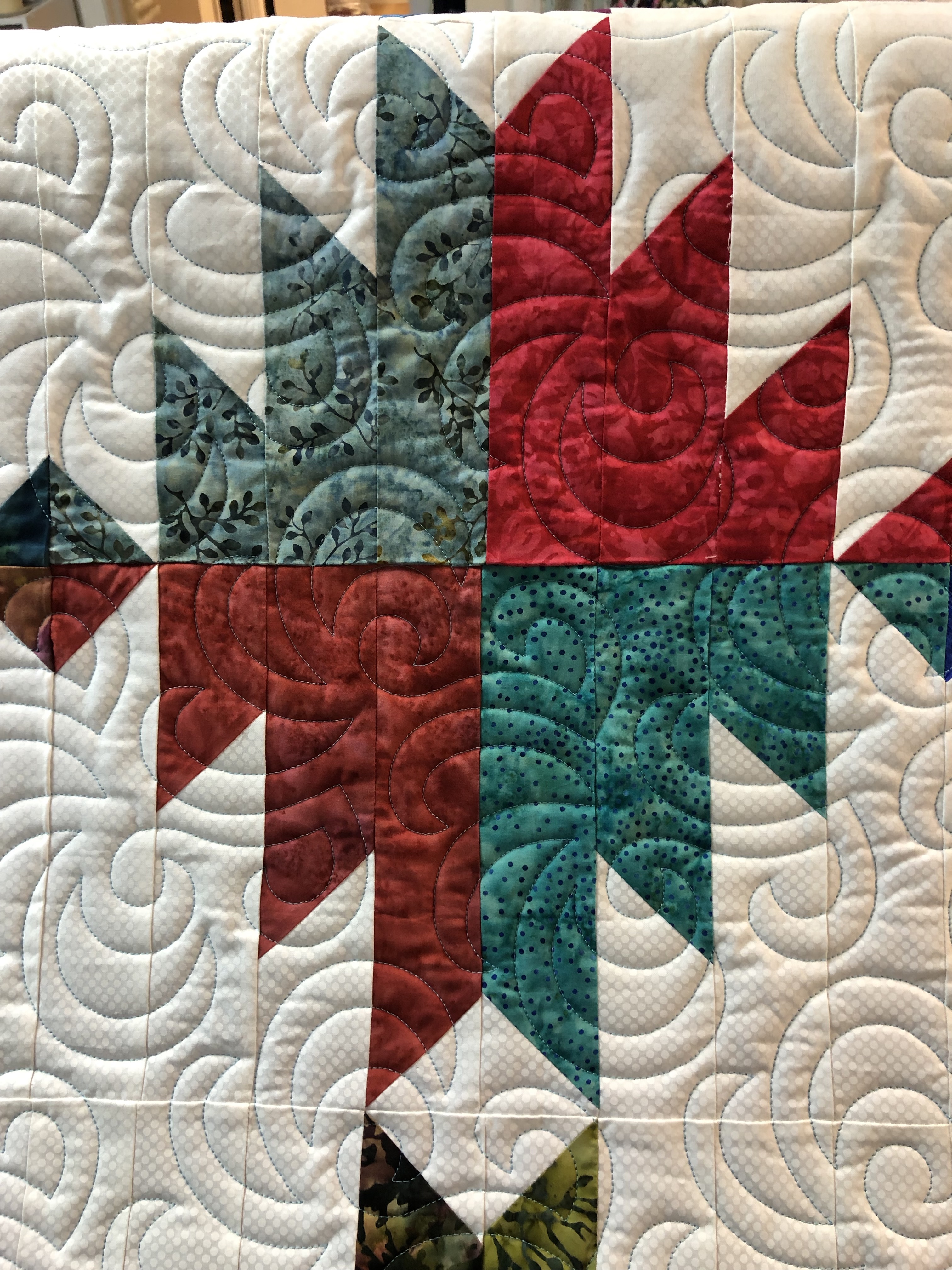 How about a mini quilt show today. Here are 3 quilts made by Kathy. 1st is Grand Adventure with quilting design Airborne. The second is a Take 5 with Feathered Curls allover. Then last is Jambalaya quilted with Cool Beans. The last has a Minky/cuddle backing. They all have Hobbs 80/20 batting inside. Kathy, I will be in touch to schedule your pick up.