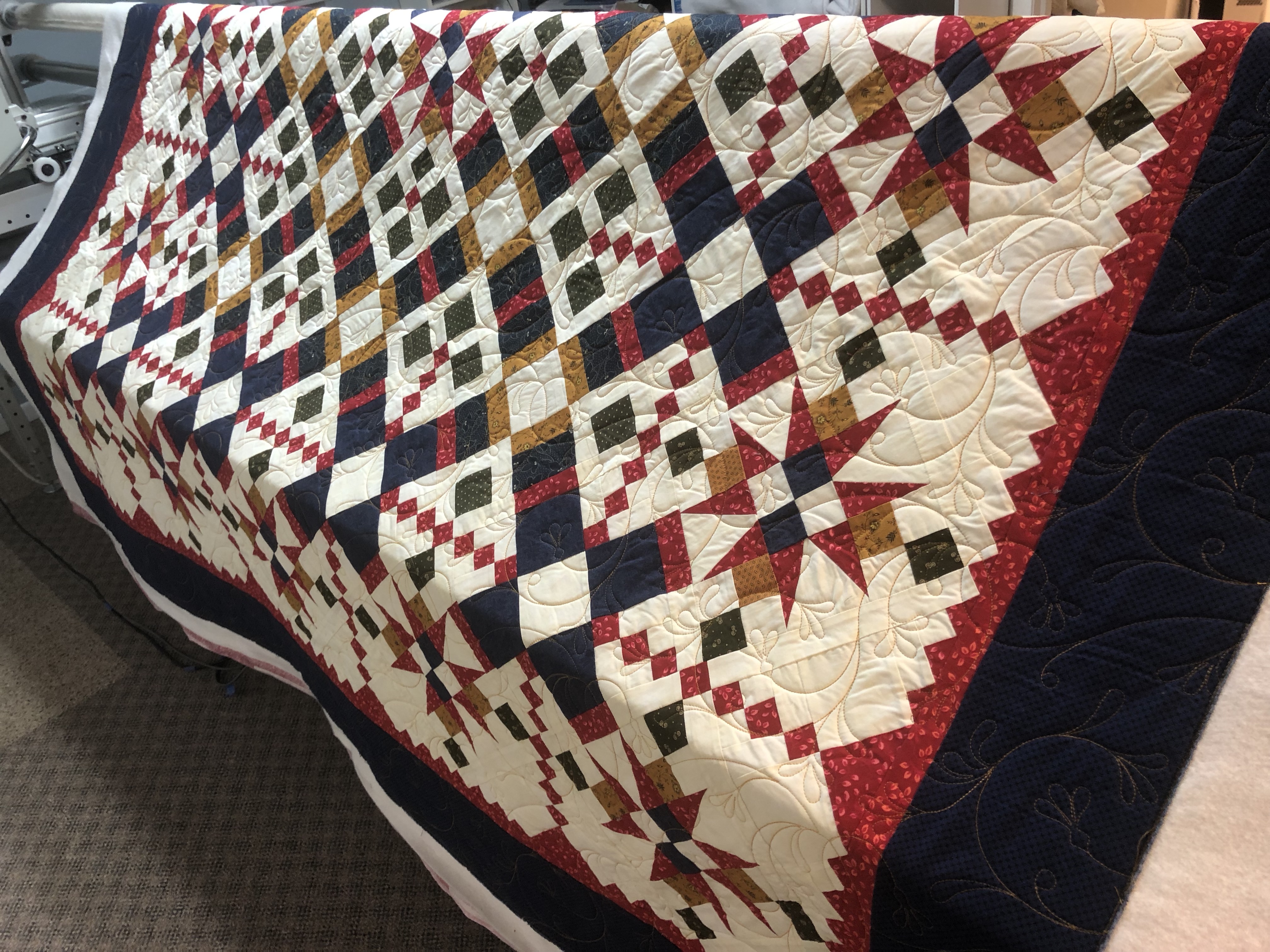 The quilting design is Persian allover, blue jean gold thread and Quilters Dream batting.