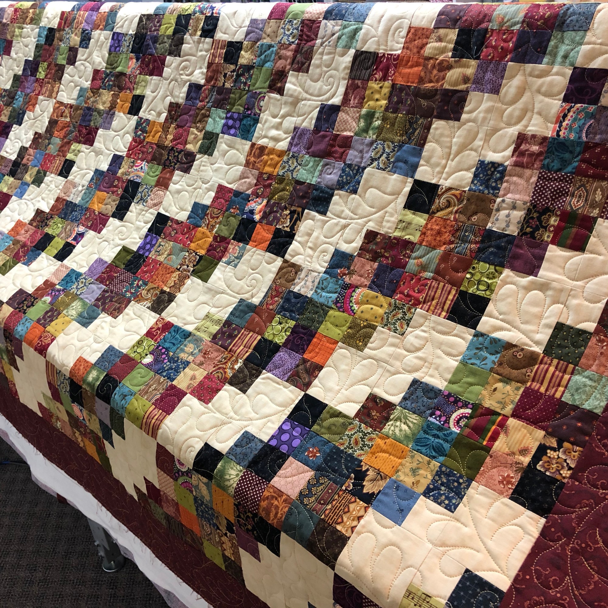 This is Connies Reproduction Chain Quilt. The quilting design is Feathered Curls, gold thread and Quilters Dream Batting. The back is flannel. This is another gift quilt. Beautiful!