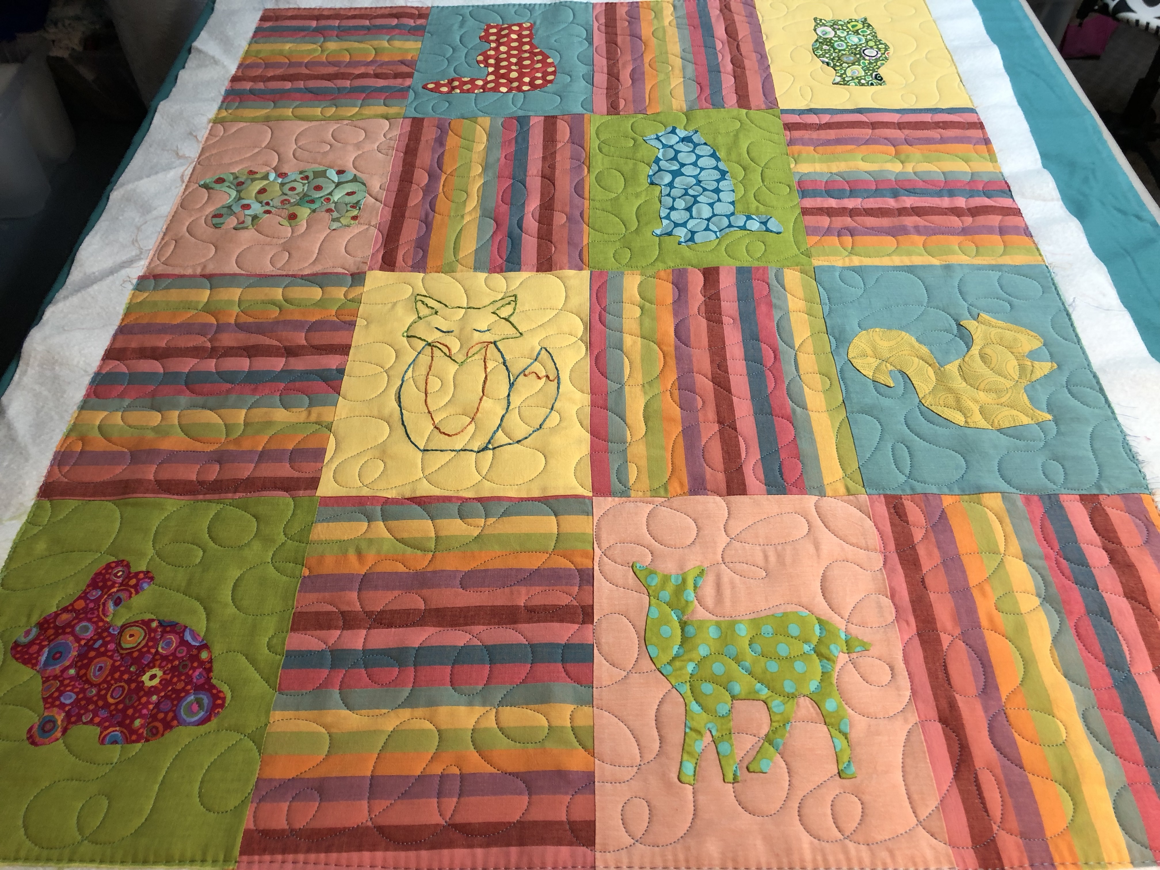 This is a gift quilt. The quilting design is Scribbles B2B, thread is teal and the batting is Quilters Dream. Her grandmother embroidered the Fox block. Nice baby quilt!