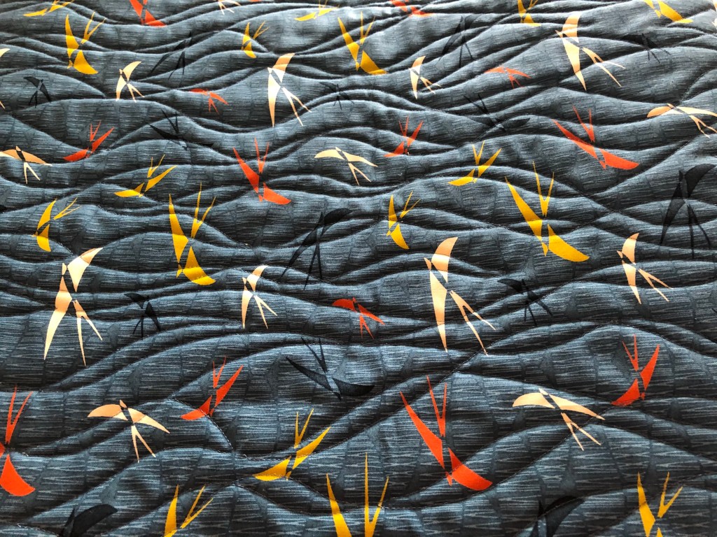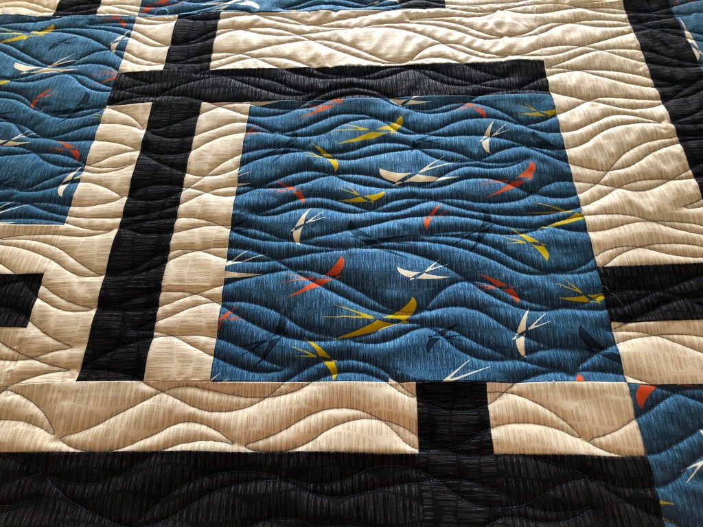 This is Martha’s BQ2 quilt. The quilting design is Waverly, blue thread and Hobbs 80/20 batting. I really like this design on her quilt.