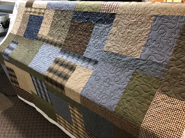 This Hey Jude Quilt was made by Michelle. The pattern is called Hey Jude. The quilting pattern is Oak Dream, thread is charcoal grey and batting is Hobbs 80/20. This is the perfect quilt for a man. Nice quilt
