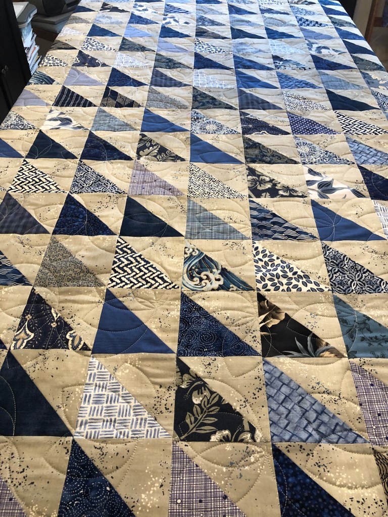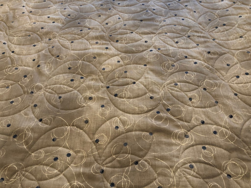 This beautiful quilt is made with Janet Clare fabrics. It was so nicely pieced and pressed. The quilting design is AM Turning Leaf, taupe thread, and Quilters Dream Poly batting. Nice quilt