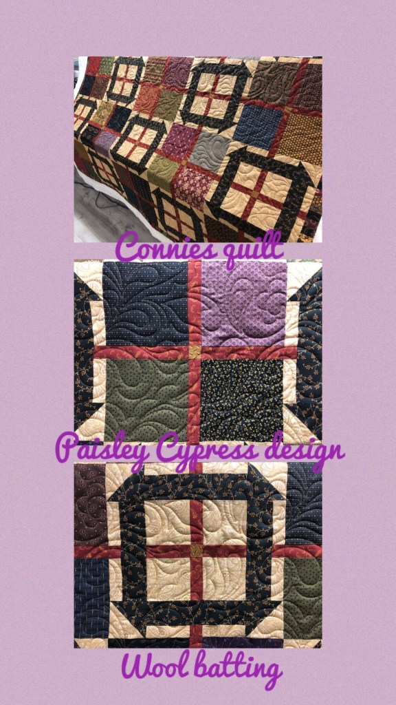 Connies quilt Posted on August 7, 2020 by Nancy Hughson - Quilted Impressions Share this: Click to share on X (Opens in new window) X Click to share on Facebook (Opens in new window) Facebook Like Loading... Related