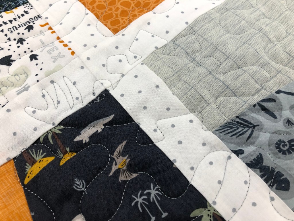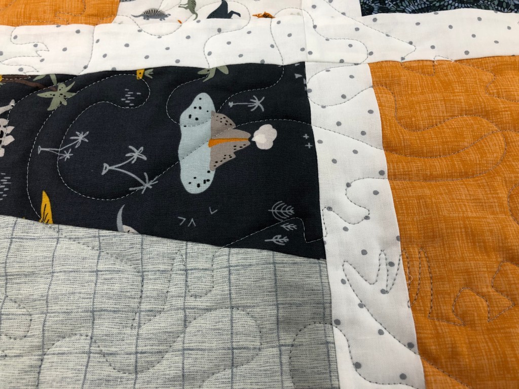 Julian’s quilt finished and ready to be shipped to him. Dave’s Dinosaurs allover quilting, silver thread, Hobbs 80/20 batting.