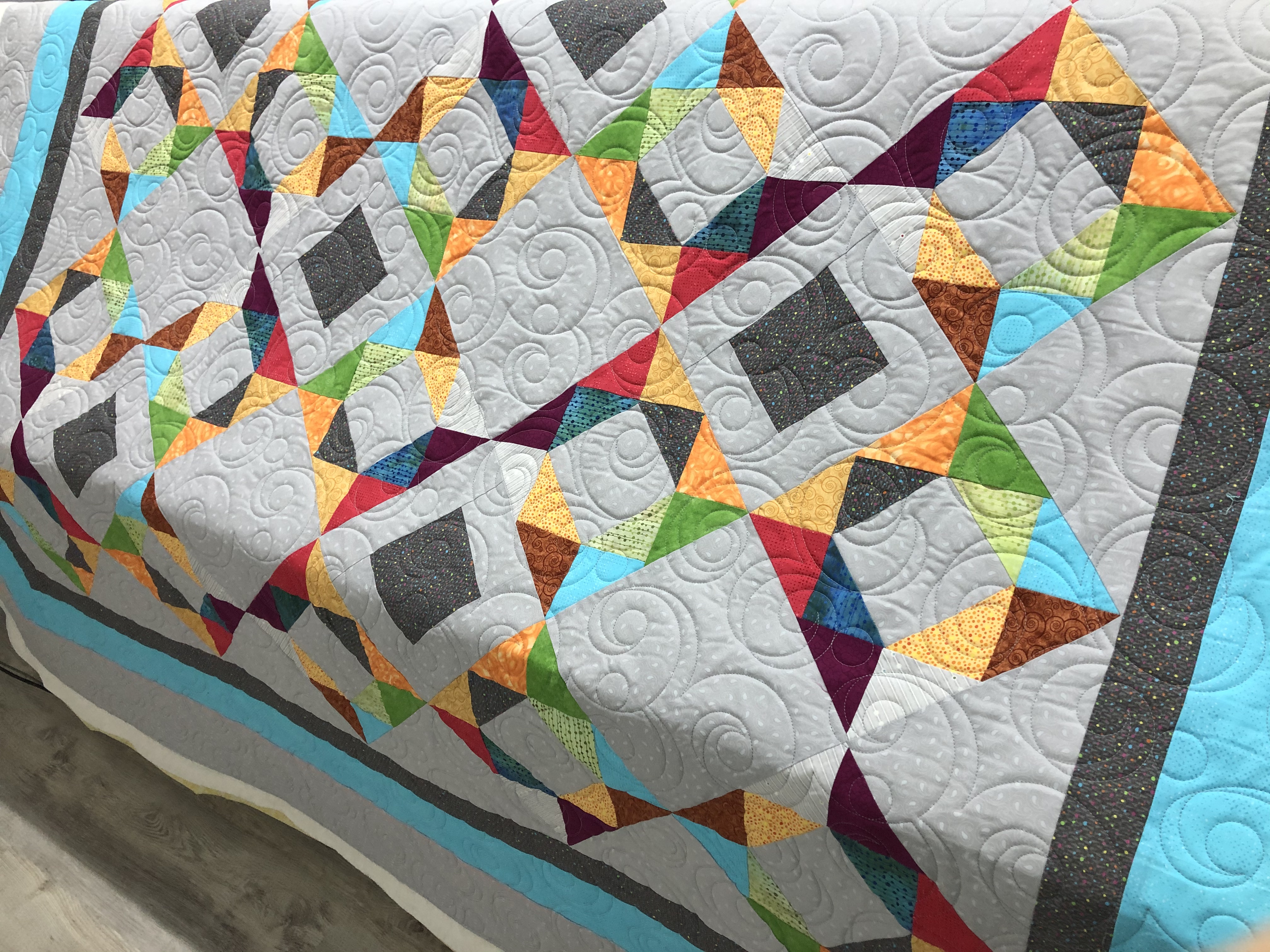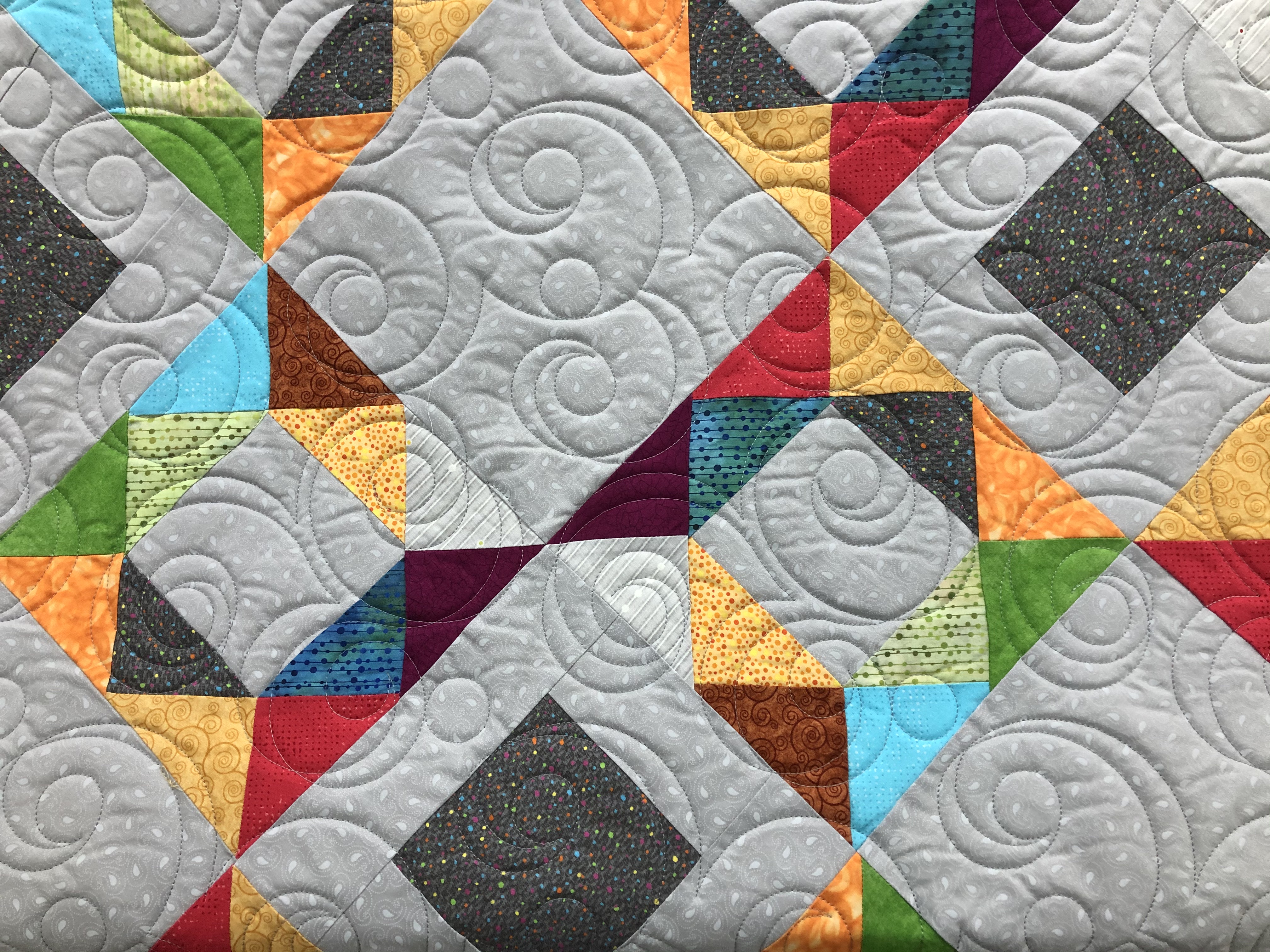 Isn’t this a pretty quilt? The quilting design is Curly E2E, light grey thread and Hobbs 80/20 batting. Can’t wait to see what her binding choice is.