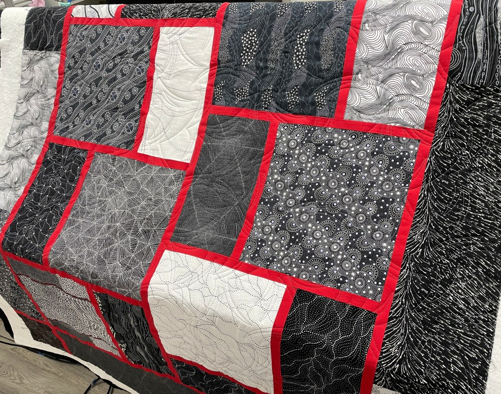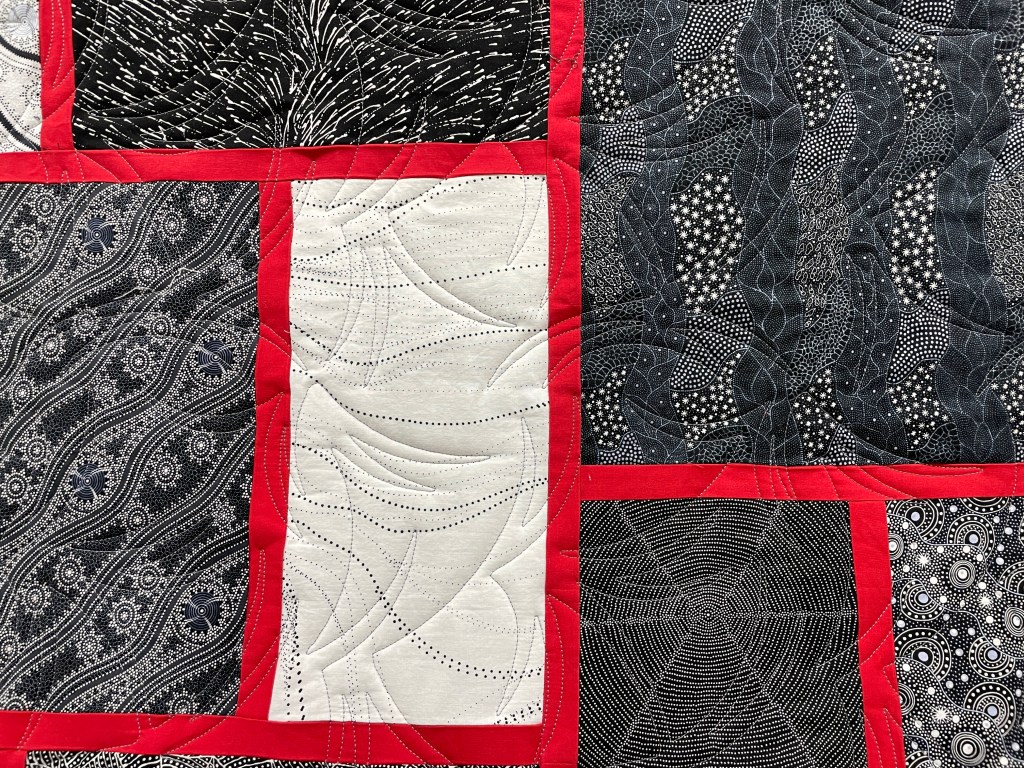 This is quilted with Splash allover design. When a quilt has busy prints it can be hard to see the quilting design. I suggest using a thread color that is not in the quilt yet compliments and is a medium contrasting color. Since this has a solid quilt back the thread will show up dramatically on the back.