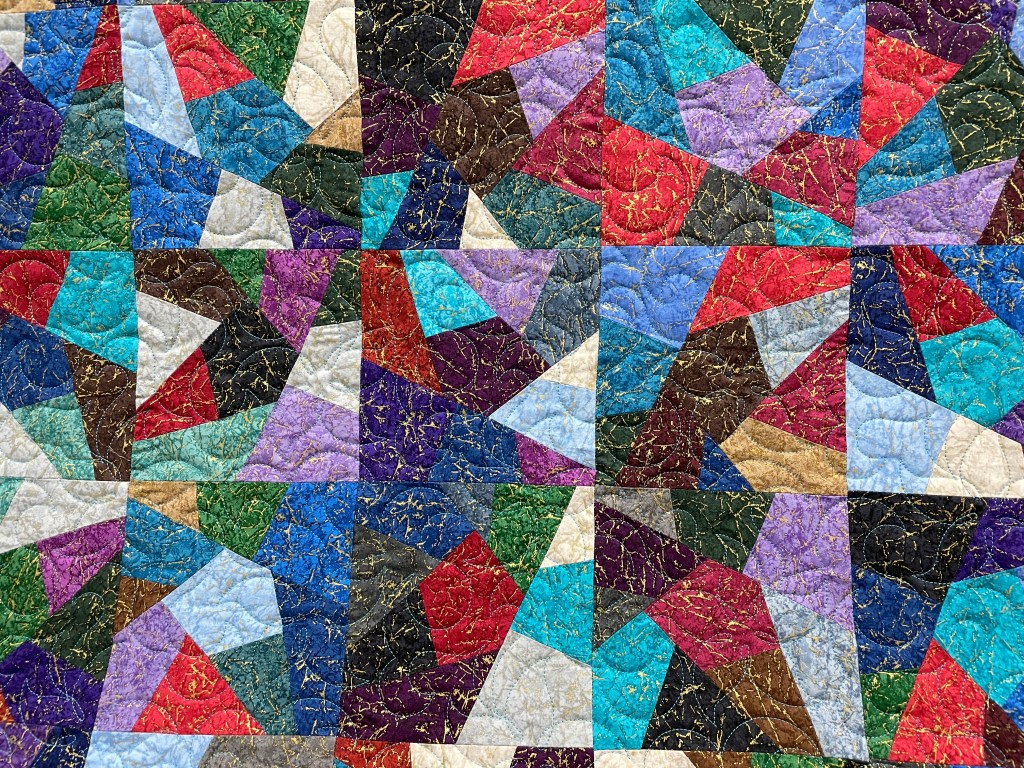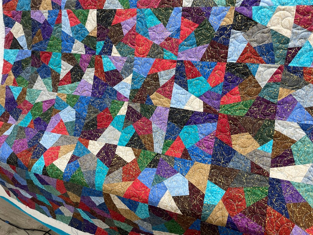This is quilted with Splash allover design. When a quilt has busy prints it can be hard to see the quilting design. I suggest using a thread color that is not in the quilt yet compliments and is a medium contrasting color. Since this has a solid quilt back the thread will show up dramatically on the back.