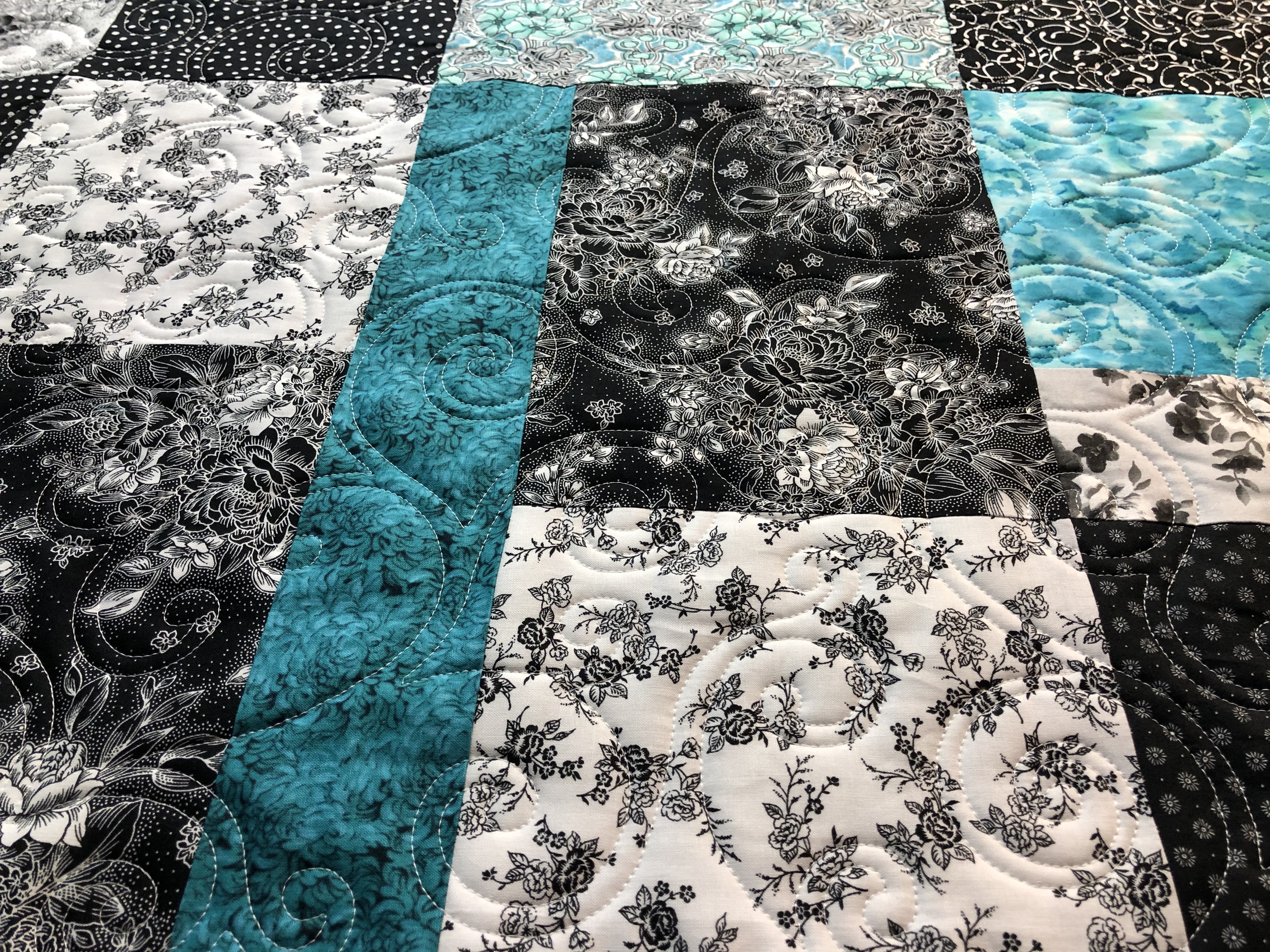 This is Loris quilt. The quilting design is Surf B2B, white thread and Hobbs white batting. Cheerful!